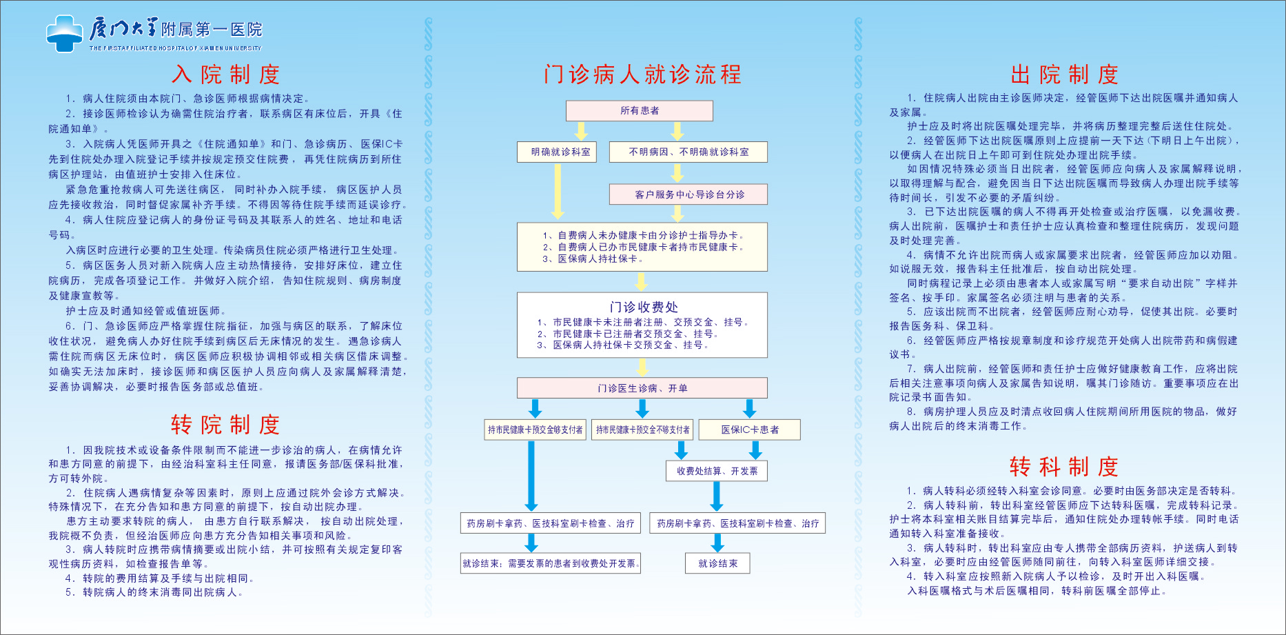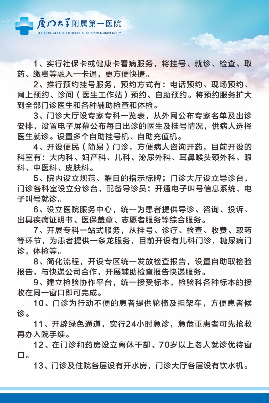 3.優(yōu)化服務(wù)流程 做到服務(wù)環(huán)境優(yōu)美,設(shè)施整潔,服務(wù)標(biāo)識規(guī)范清楚,按時(shí)開足掛號、收費(fèi)、取藥采血等服務(wù)窗口,縮短患者排隊(duì)等候時(shí)間。實(shí)行首問(診)負(fù)責(zé)、導(dǎo)診、咨詢、預(yù)約服務(wù)等便民服務(wù)措施。