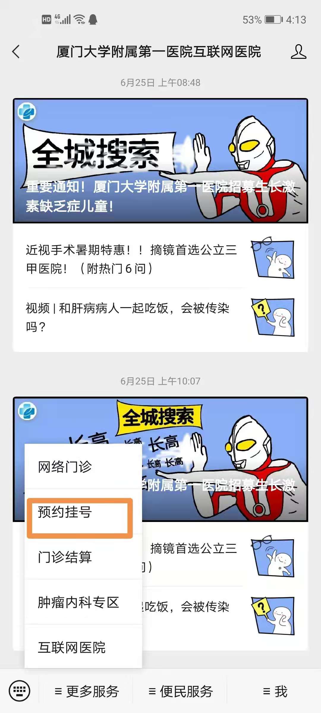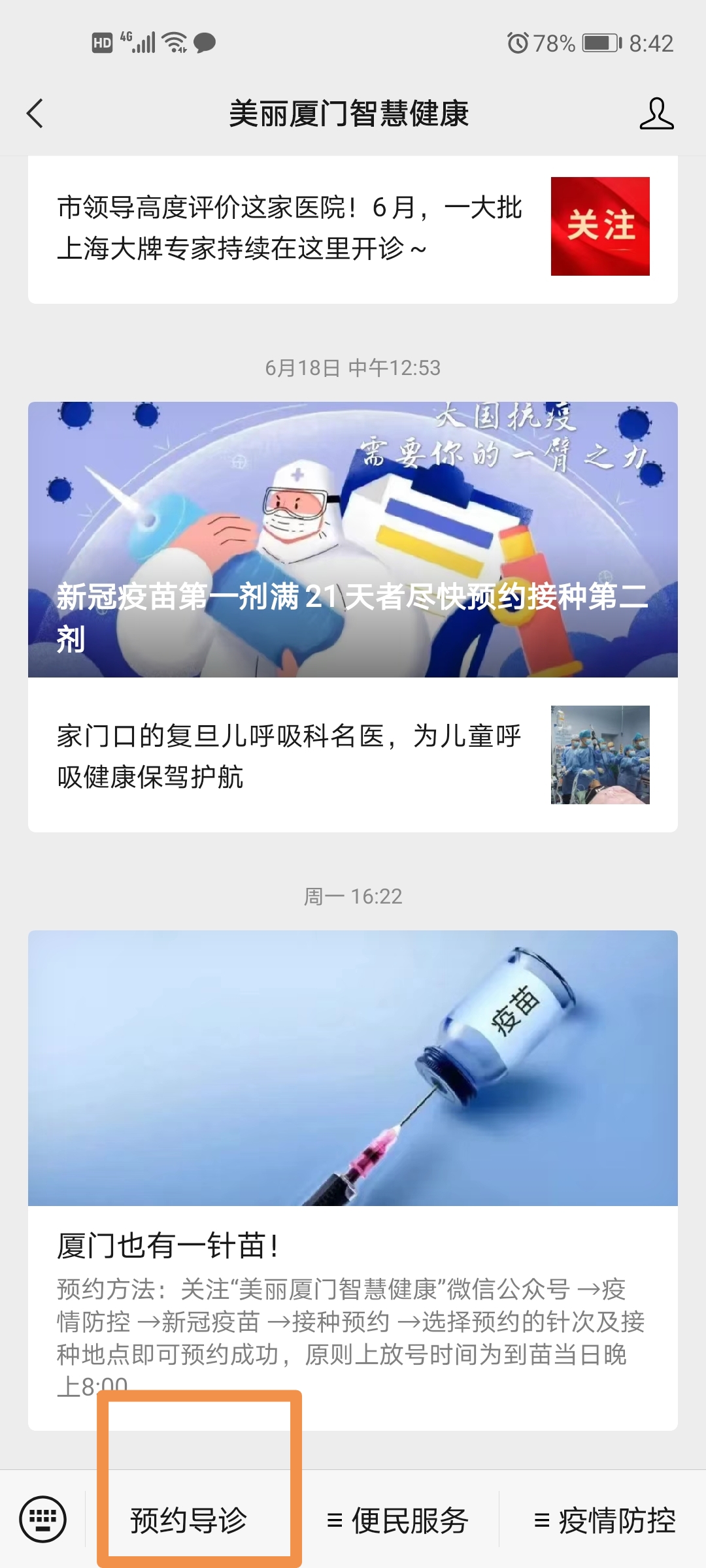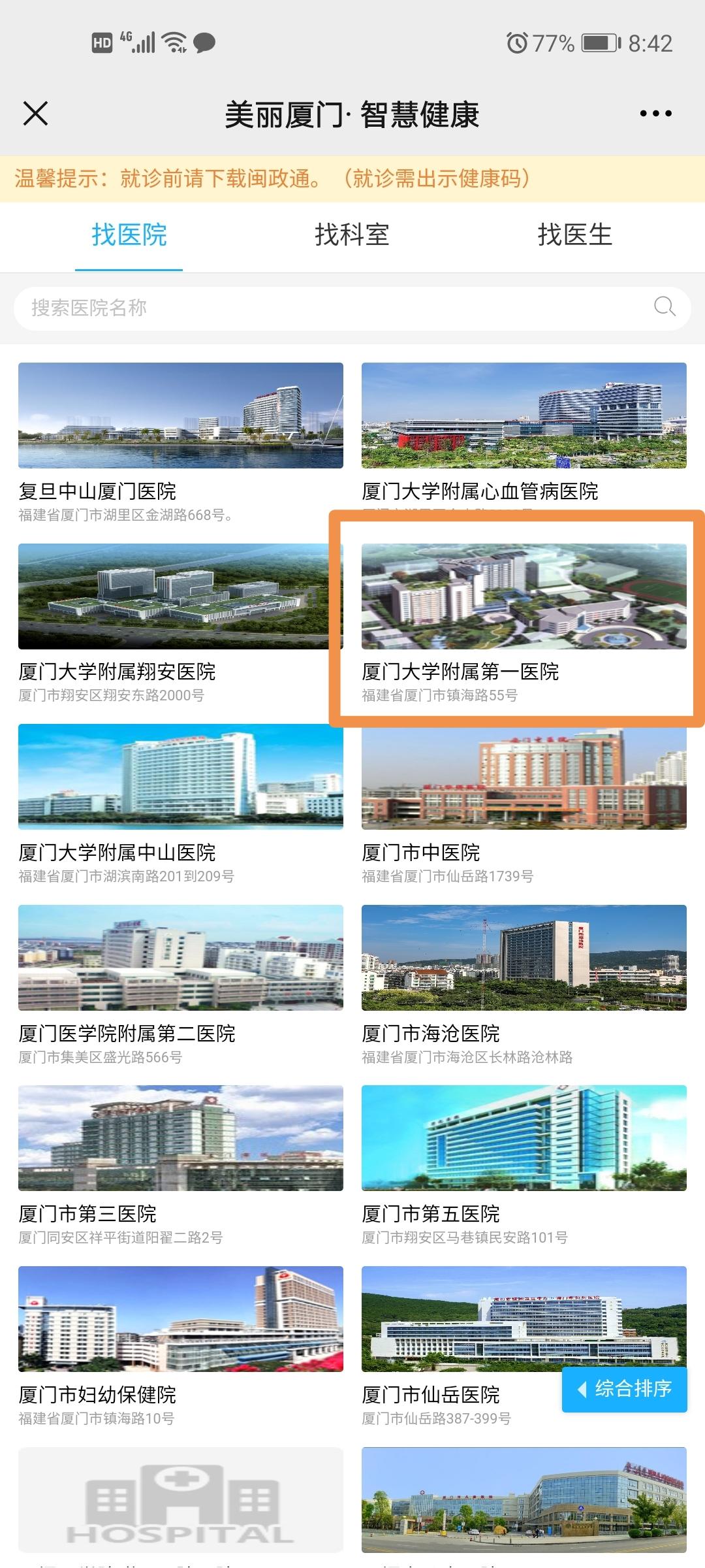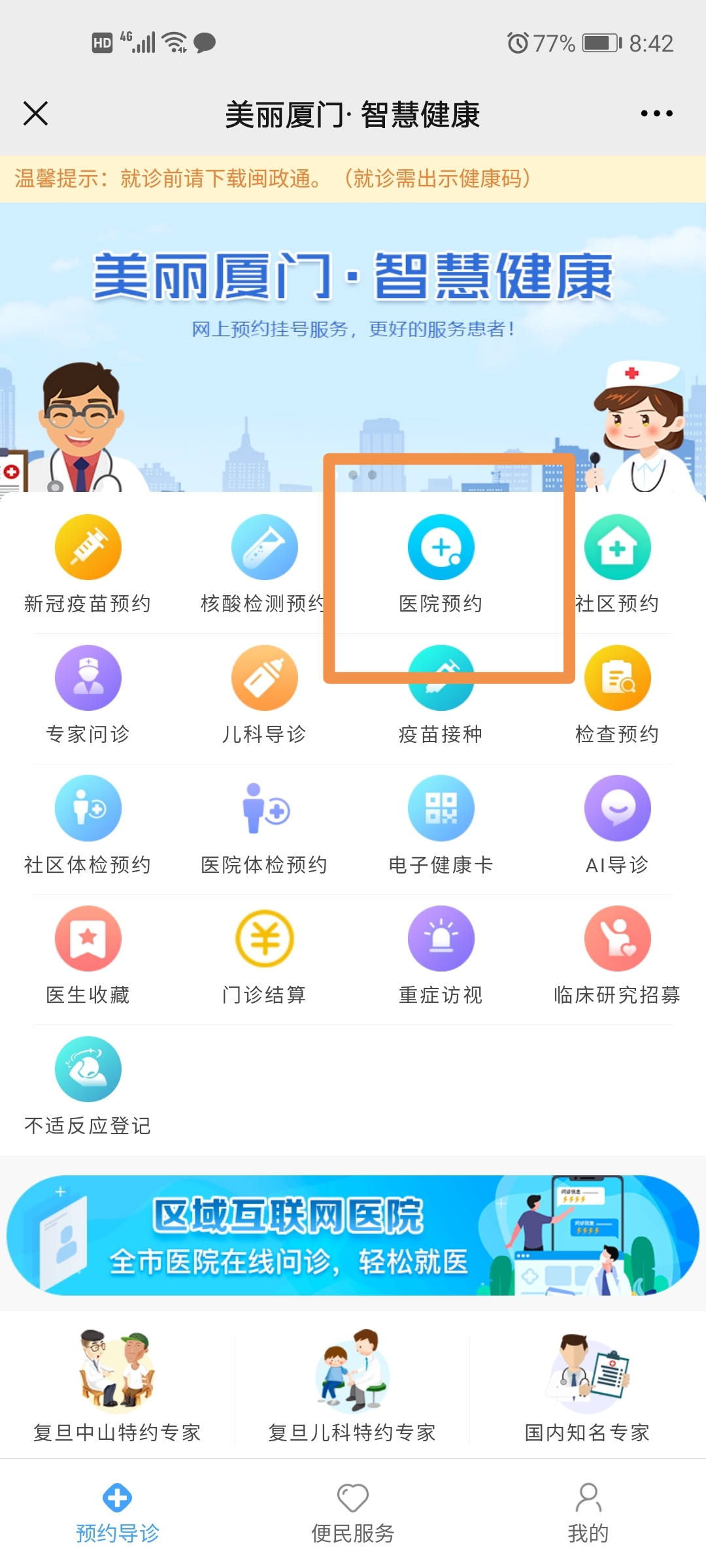 2.關(guān)注美麗廈門登錄后點擊預(yù)約導(dǎo)診