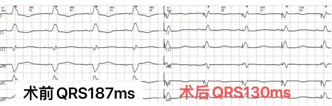 術(shù)后,開啟了CRT AutoAdapt功能,通過單左室起搏和右室自身下傳激動形成融合,QRS波由術(shù)前187ms縮短至130ms,提示左右心室不同步的情況得到明顯改善。