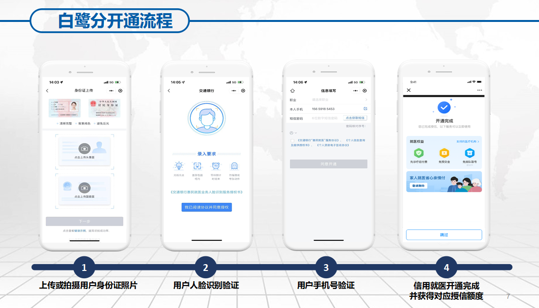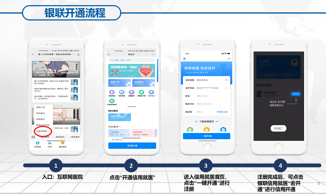 市民開通個(gè)人信用白鷺分信用就醫(yī),可通過白鷺分及廈門大學(xué)附屬第一醫(yī)院互聯(lián)網(wǎng)醫(yī)院公眾號(hào)兩種方式。進(jìn)入白鷺分公眾號(hào),在首頁找到信用就醫(yī)點(diǎn)擊“申請(qǐng)開通”后選擇授信銀行,跳轉(zhuǎn)授信銀行后上傳或拍攝身份證,進(jìn)行人臉識(shí)別及手機(jī)號(hào)驗(yàn)證后即可完成開通并獲得對(duì)應(yīng)授信額度。此外,市民也可通過廈門大學(xué)附屬第一醫(yī)院互聯(lián)網(wǎng)醫(yī)院公眾號(hào)進(jìn)行開通,菜單欄進(jìn)入互聯(lián)網(wǎng)醫(yī)院并點(diǎn)擊“開通信用就醫(yī)”,完成注冊(cè)后選擇銀聯(lián)簽約銀行卡進(jìn)行綁定,校驗(yàn)完成即可成功簽約開通。