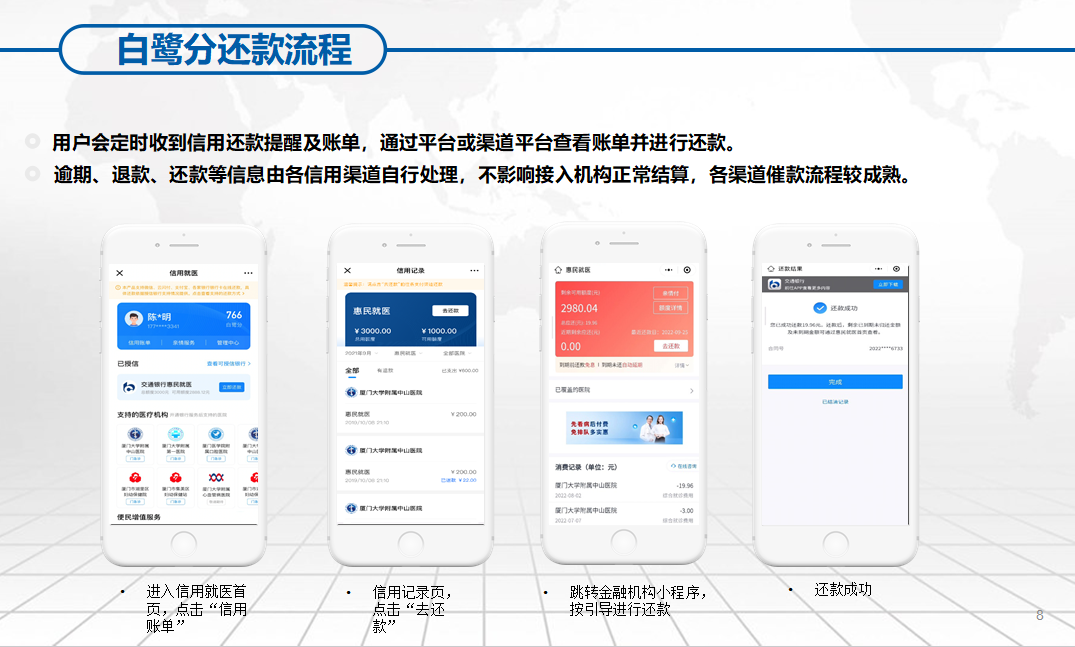 還款方面,市民收到信用還款提醒及賬單,可通過白鷺分公眾號(hào)進(jìn)入信用就醫(yī)首頁并點(diǎn)擊“信用賬單”,選擇“去還款”后自動(dòng)跳轉(zhuǎn)至金融機(jī)構(gòu)小程序,可按提示完成還款操作。通過廈門大學(xué)附屬第一醫(yī)院互聯(lián)網(wǎng)醫(yī)院開通信用就醫(yī)的市民,直接前往已綁定銀行卡或使用微信、支付寶還款即可。