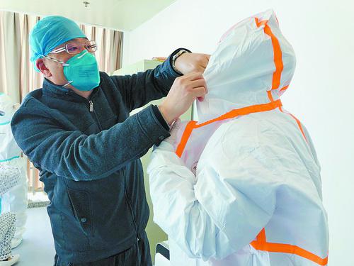 樂家振副院長幫隊(duì)員穿隔離衣。