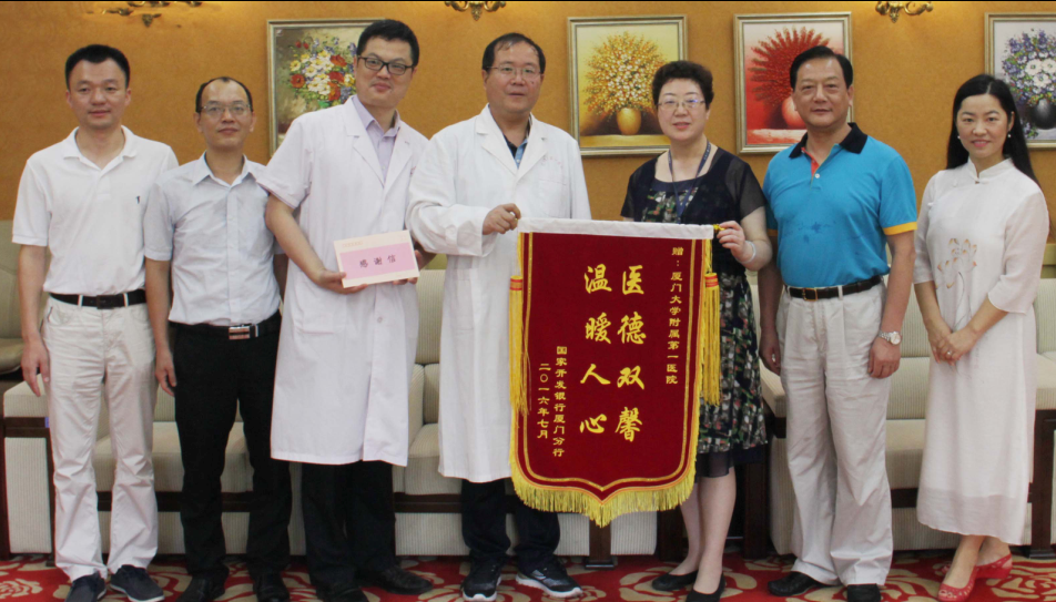 一面寫著“醫(yī)德雙馨,溫暖人心”的錦旗由國家開發(fā)銀行廈門分行黨委委員、副行長宋素燕送到了廈門大學(xué)附屬第一醫(yī)院。醫(yī)者仁者愛人,患者感恩之情,譜寫了一曲醫(yī)患真情。
