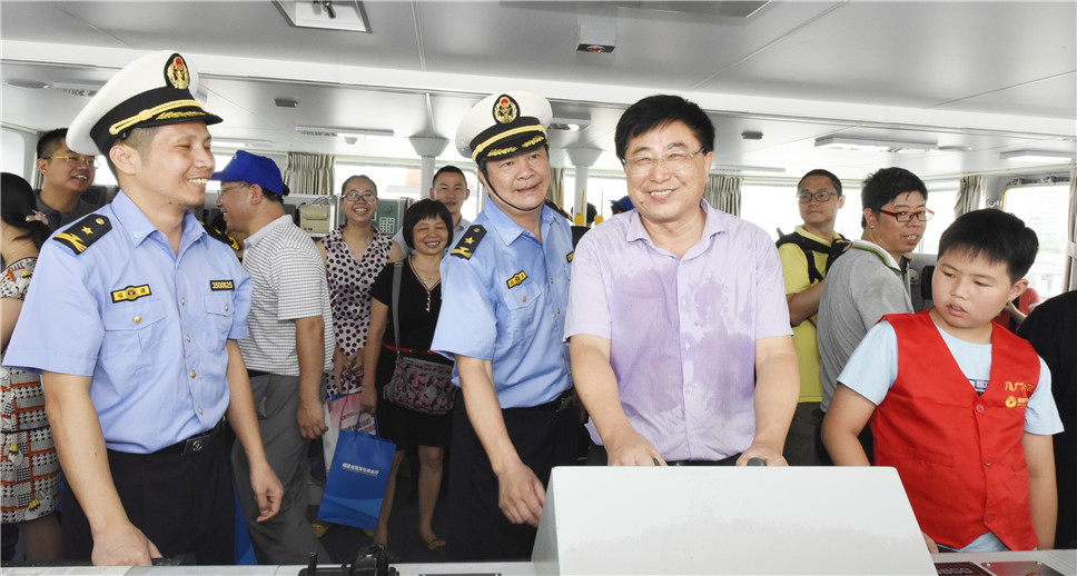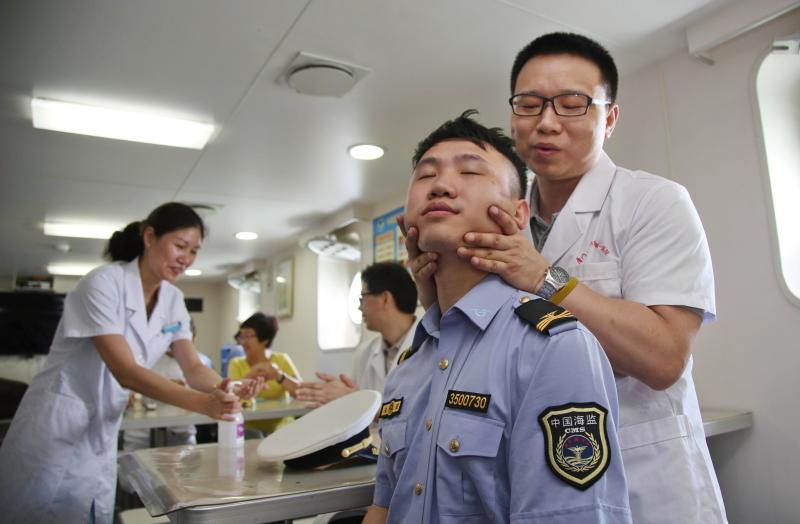 6月11日上午,在福建省海洋與漁業(yè)廳主辦,福建省海洋與漁業(yè)執(zhí)法總隊(duì)主辦,廈門日?qǐng)?bào)社承辦的“中國海警2115船”海洋維權(quán)公眾開放日活動(dòng)中,廈門大學(xué)附屬第一醫(yī)院院長姜杰帶領(lǐng)15名醫(yī)務(wù)人員,登上中國海警2115船, 為船上人員進(jìn)行了身體檢查。