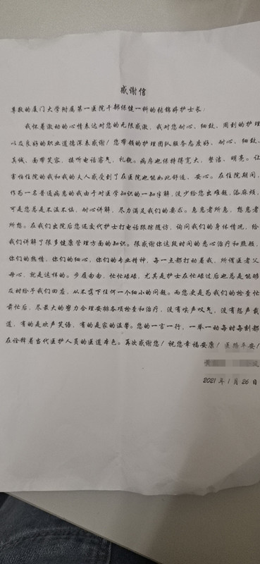 上一條:患者感謝干部保健二科醫(yī)生陳津瀚、楊奕軒、黃上萌、護(hù)士荊小奚、滿(mǎn)廣珍及11樓全體護(hù)士