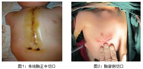 在短短2個(gè)月內(nèi),心臟外科除了開展先天性心臟病、成人瓣膜病、冠心病、大血管疾病、感染性心內(nèi)膜炎等常見心臟外科疾病外,針對(duì)嬰幼兒及部分成人胸腔小、肋骨彈性大、胸廓側(cè)壁肌肉薄弱等高難度手術(shù),近日心外科積極推出外側(cè)小切口剖胸行心臟手術(shù)這一嶄新技術(shù)。傳統(tǒng)心臟外科體外循環(huán)手術(shù)均采用胸正中切口縱劈胸骨入路,但縱劈胸骨創(chuàng)傷大,失血量多,易發(fā)生切口及胸骨感染,影響美觀。部分小兒手術(shù)后因胸廓骨架的破壞,容易發(fā)生胸骨前凸等畸形。而采用右外側(cè)小切口剖胸矯治心臟畸形的手術(shù)路徑,有以下優(yōu)點(diǎn):1、避免損傷胸骨,極大減輕病人的身體及精神創(chuàng)傷;2、創(chuàng)傷小,出血少,恢復(fù)快,傷口外形美觀等特點(diǎn)(見圖1、2);3、幼兒患者術(shù)后體內(nèi)不遺留鋼絲等金屬異物,極大提高患兒日后的生活質(zhì)量。