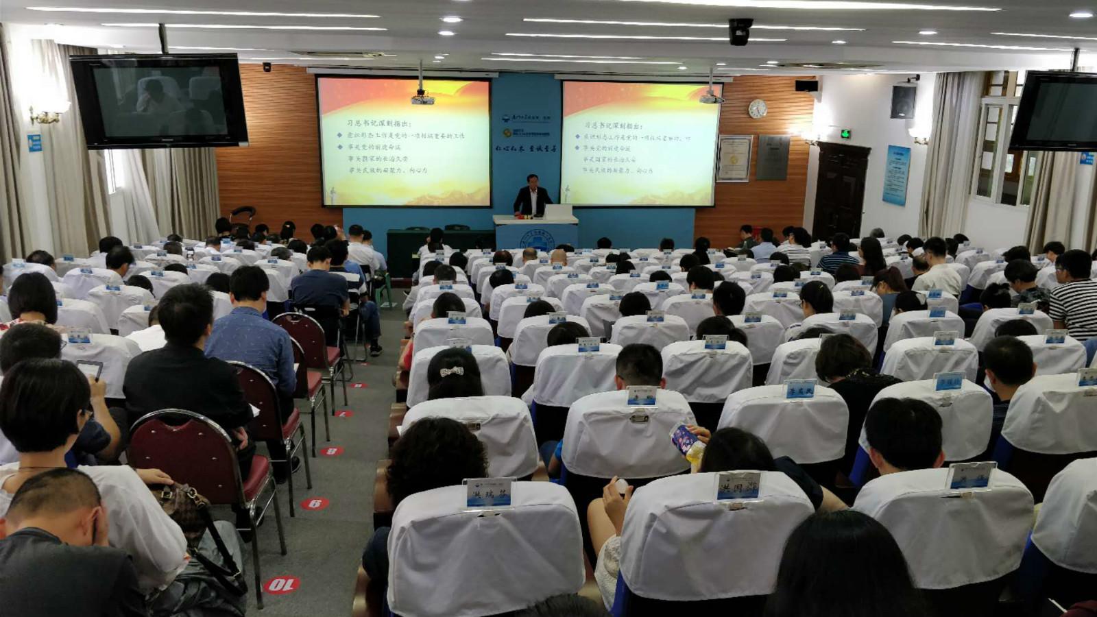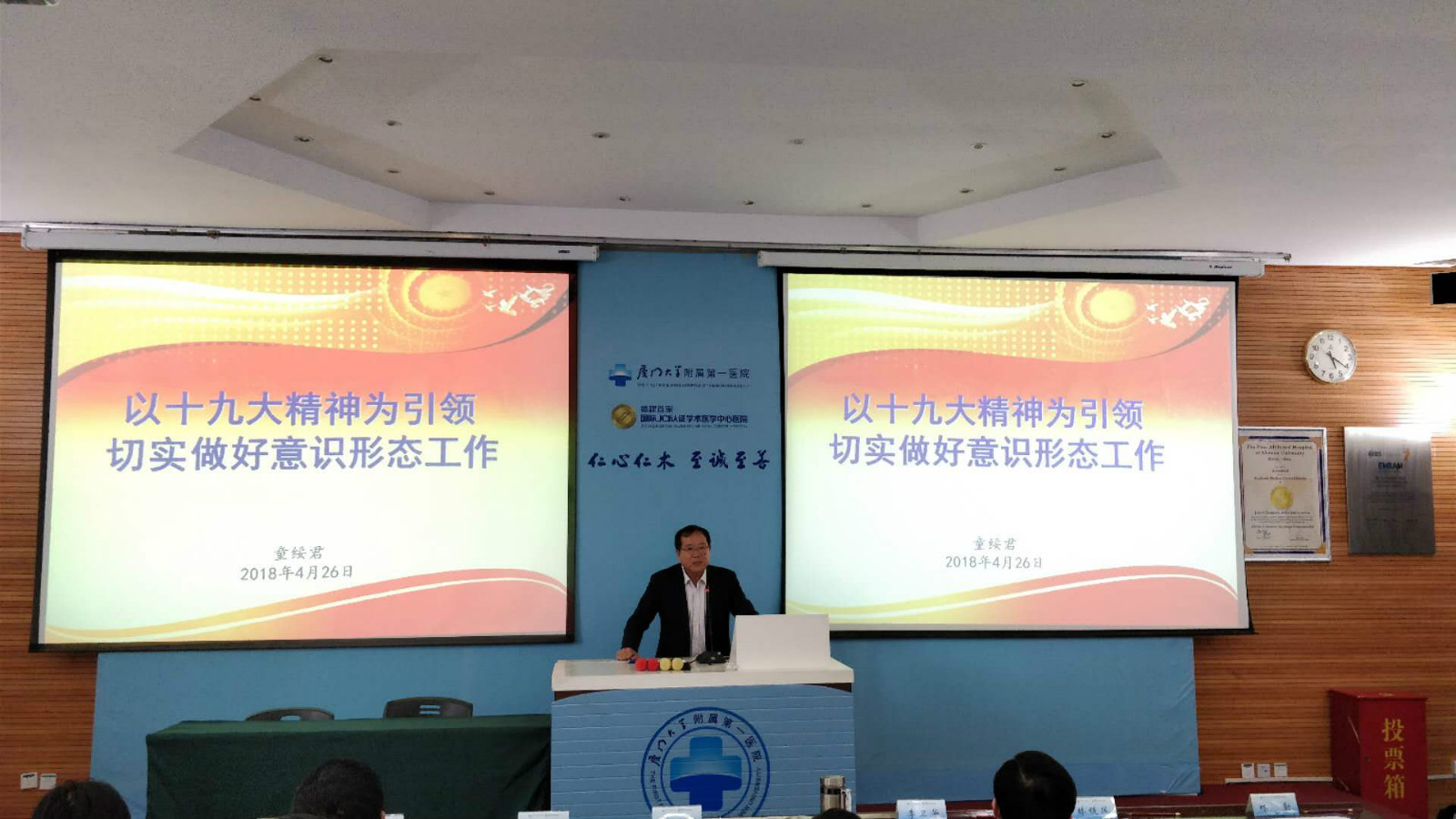 2018年4月26日,廈門大學附屬第一醫(yī)院在科教樓418會議室召開中層干部會,會上院黨委書記童綏君同志以《以十九大精神為引領(lǐng)切實做好意識形態(tài)工作》為題作專題輔導黨課。童綏君同志在開篇提到,習近平總書記指出意識形態(tài)工作是黨的一項極端重要的工作,事關(guān)黨的前途命運,事關(guān)國家的長治久安,事關(guān)民族凝聚力、向心力。童綏君同志指出,當前意識形態(tài)領(lǐng)域的形勢依然錯綜復雜,面臨的風險挑戰(zhàn)依然嚴峻,意識形態(tài)領(lǐng)域斗爭呈現(xiàn)出日益復雜化、多樣化趨勢,因此,要堅持以習近平新時代中國特色社會主義思想為指導,切實增強“四個意識”和“四個自信”,緊緊圍繞學習宣傳貫徹黨的十九大精神這條主線,做好意識形態(tài)領(lǐng)域的各項工作。要堅持黨性原則,黨性原則是意識形態(tài)工作的根本原則,在政治方向、輿論導向、價值取向上立場堅定,傳播好黨的聲音和主張。童綏君同志強調(diào)要做好意識形態(tài)工作必須壓緊壓實責任,管好守好陣地,堅持屬地管理、分級負責和誰主管、誰負責原則,實行責任追究制度。最后,童綏君同志提出了對醫(yī)院意識形態(tài)工作的相關(guān)要求以及對下一階段的工作內(nèi)容進行部署。