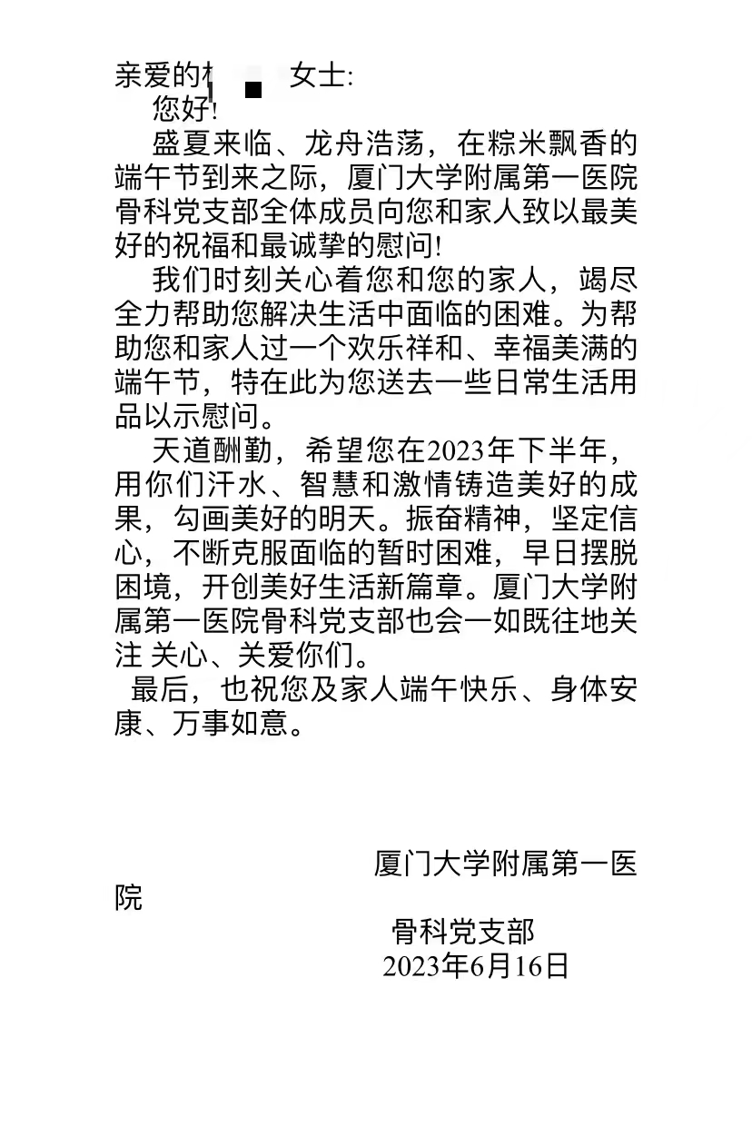 6月17日,骨科黨支部開展“愛心廈門”結(jié)對(duì)幫扶活動(dòng),為支部結(jié)對(duì)幫扶對(duì)象獻(xiàn)愛心、送溫暖。以端午節(jié)為契機(jī),在開元愛心屋采購慰問生活用品,送到幫扶對(duì)象林女士的家里,帶去節(jié)日的問候,并寫了一封家書鼓勵(lì)林女士克服臨時(shí)的困難,開創(chuàng)美好生活的新篇章。