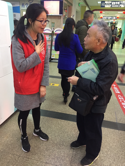 在學(xué)習(xí)了必備的導(dǎo)診知識(shí)后,幾名青年志愿者們便紛紛投入到志愿服務(wù)工作中。此次的志愿者活動(dòng)主要在門診大廳及中庭休息區(qū)。在門診大廳中,志愿者們更多的了解到,雖然信息化及數(shù)字化的管理使得現(xiàn)在醫(yī)院工作效率有了很大的提高,但對于一些年級較大的患者而言,這些是陌生的。身為志愿者,臨床學(xué)子表示,在臨床學(xué)習(xí)之余,有責(zé)任與義務(wù)去幫助患者更為便捷的就醫(yī)。