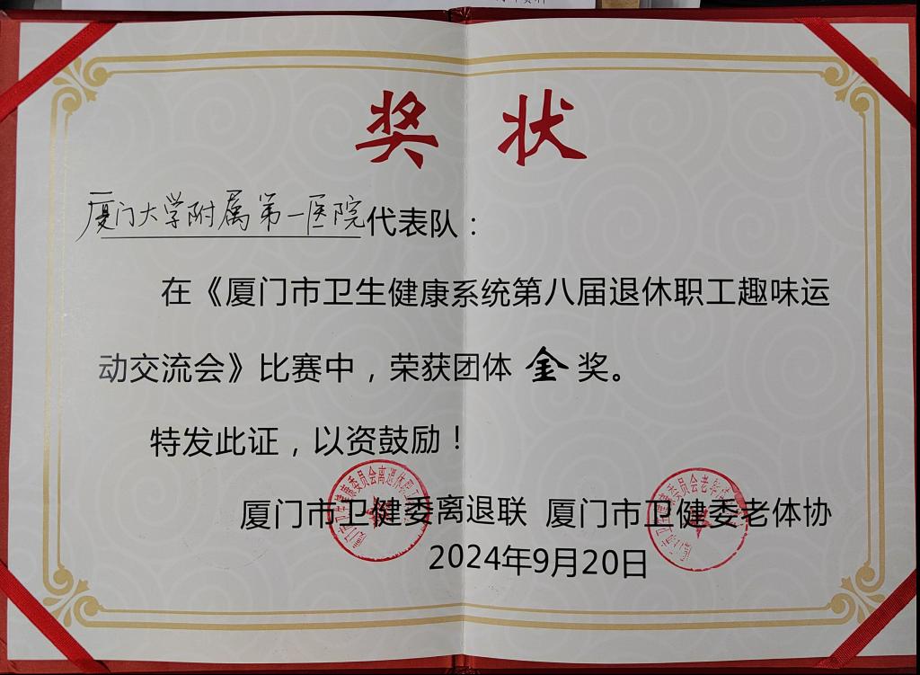 在2024年度市衛(wèi)健系統(tǒng)離退休職工趣味運(yùn)動(dòng)會(huì)上,我院代表隊(duì)榮獲團(tuán)體金獎(jiǎng)(總分第一名)的好成績!
