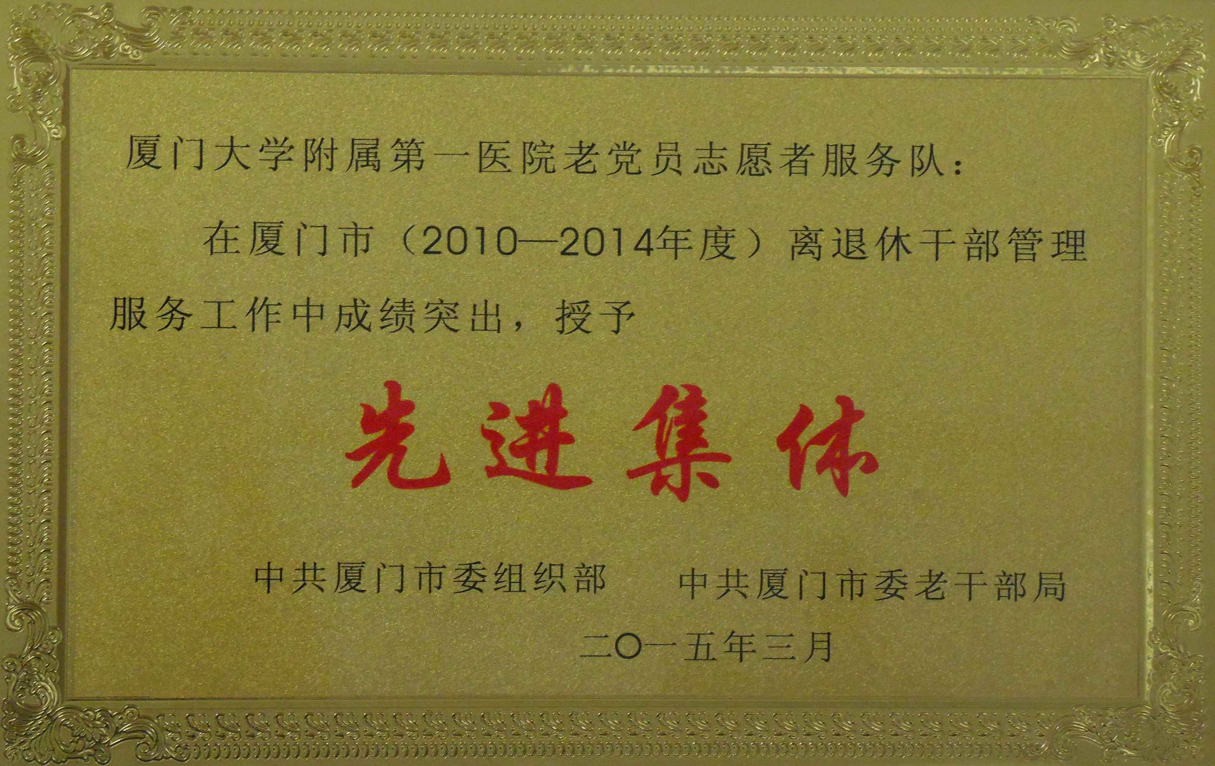 廈門大學(xué)附屬第一醫(yī)院老黨員志愿者服務(wù)隊(duì)于2014年、2015年連續(xù)兩年被中共廈門市委組織部、老干部局授予優(yōu)秀、先進(jìn)集體。今后他們將繼續(xù)努力,認(rèn)真學(xué)習(xí)貫徹黨的十八屆四中全會(huì)精神,堅(jiān)持以奉獻(xiàn)他人,提升自我為志愿服務(wù)精神,充分發(fā)揮專業(yè)人才特長,自覺為社會(huì)、為他人提供力所能及的幫助,為黨的事業(yè)增添正能量,為建設(shè)美麗廈門奉獻(xiàn)余熱!