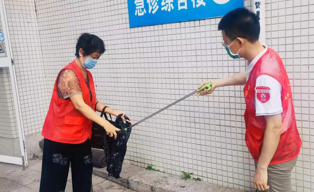 啟動儀式后,各支部的同志們分頭行動,有的兩兩配合、在院區(qū)各個角落用垃圾鉗撿拾煙頭等垃圾,有的向過往群眾分發(fā)控?zé)熜麄鞑牧?,有的及時制止正在吸煙或準(zhǔn)備吸煙的群眾。