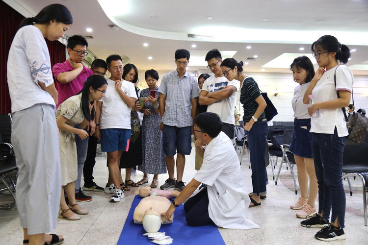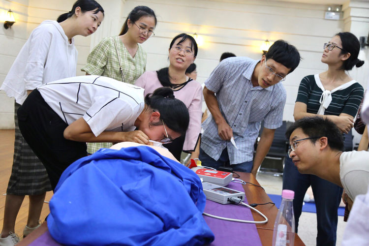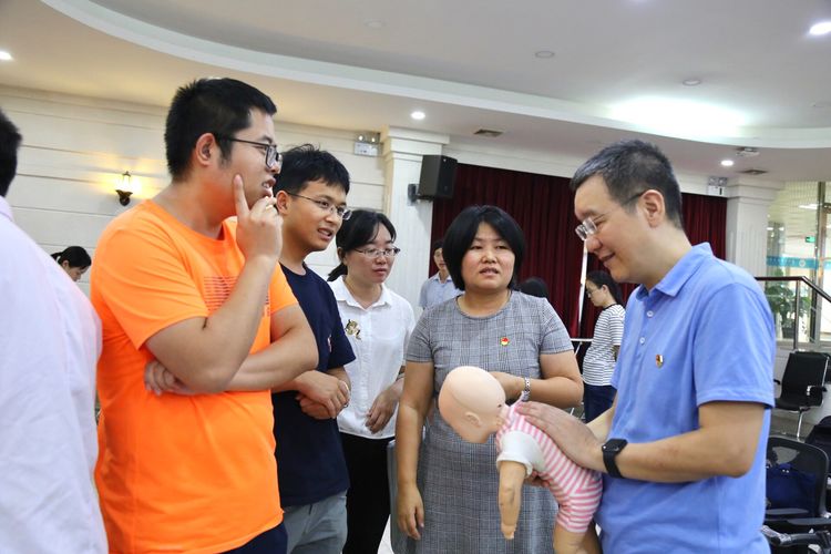 說千遍不如練一次,醫(yī)生護士們按計劃分為5小組,圍繞著5個模擬人模型,指導在場聽眾進行實際操作,現(xiàn)場參訓者踴躍嘗試,接受規(guī)范的要領(lǐng)指正,體驗了爭分奪秒的緊張時刻。