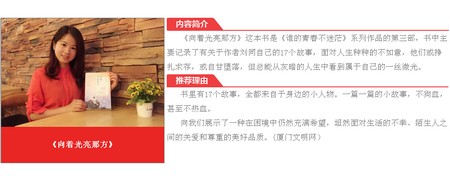 好書推薦:《向著光亮那方》書籍簡介:《向著光亮那方》這本書是誰的青春不迷茫系列之三,這本書的主題就是光亮,正如劉同所說,每個人面對生活都有掙扎、困惑、無助、委屈、不服,可每個人面對未來又無比的堅韌、相信、努力、堅持、奔跑。書中主要記錄了有關(guān)于劉同自己的17個故事,面對種種人生的不如意,他們或掙扎求存,或自甘墮落,但總能從灰暗的人生中看到屬于自己的一絲微光。 書中收錄了《扛著梯子走的人》《聰明的孩子,提著易碎的燈籠》《我的傻瓜表叔》《一碗西紅柿雞蛋湯》《她一直在老地方》《老媽和我,有時還有老爸》等17個故事。從“青春受謝,白日昭只”的21歲到“慨當以慷,憂思難忘”的35歲,在這美麗而崎嶇的人生路上,讓我們有一次短暫而盡興的交談。從平凡開始,以平凡結(jié)束。永遠有和煦的燈火,照亮這小小的世界。