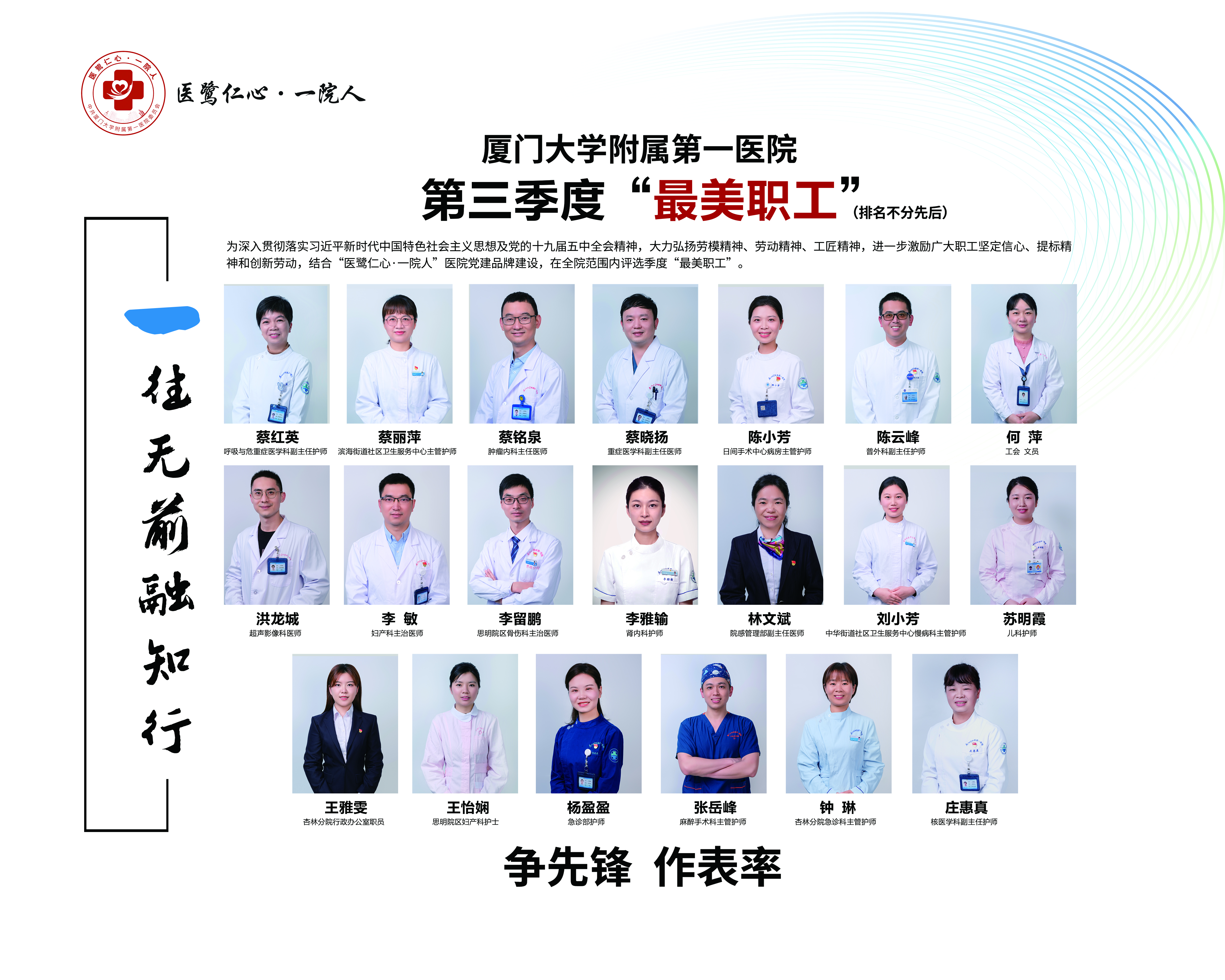 根據(jù)《中共廈門(mén)大學(xué)附屬第一醫(yī)院委員會(huì)、廈門(mén)大學(xué)附屬第一醫(yī)院關(guān)于評(píng)選季度“最美職工”活動(dòng)方案》(廈一院黨委〔2021〕2號(hào))工作安排,為樹(shù)立正面典型,弘揚(yáng)正能量,進(jìn)一步凝聚思想共識(shí),為醫(yī)院高質(zhì)量發(fā)展匯聚合力,經(jīng)評(píng)選,確定林文斌等20位同志為廈門(mén)大學(xué)附屬第一醫(yī)院第三季“最美職工”,并予以通報(bào)表?yè)P(yáng)。