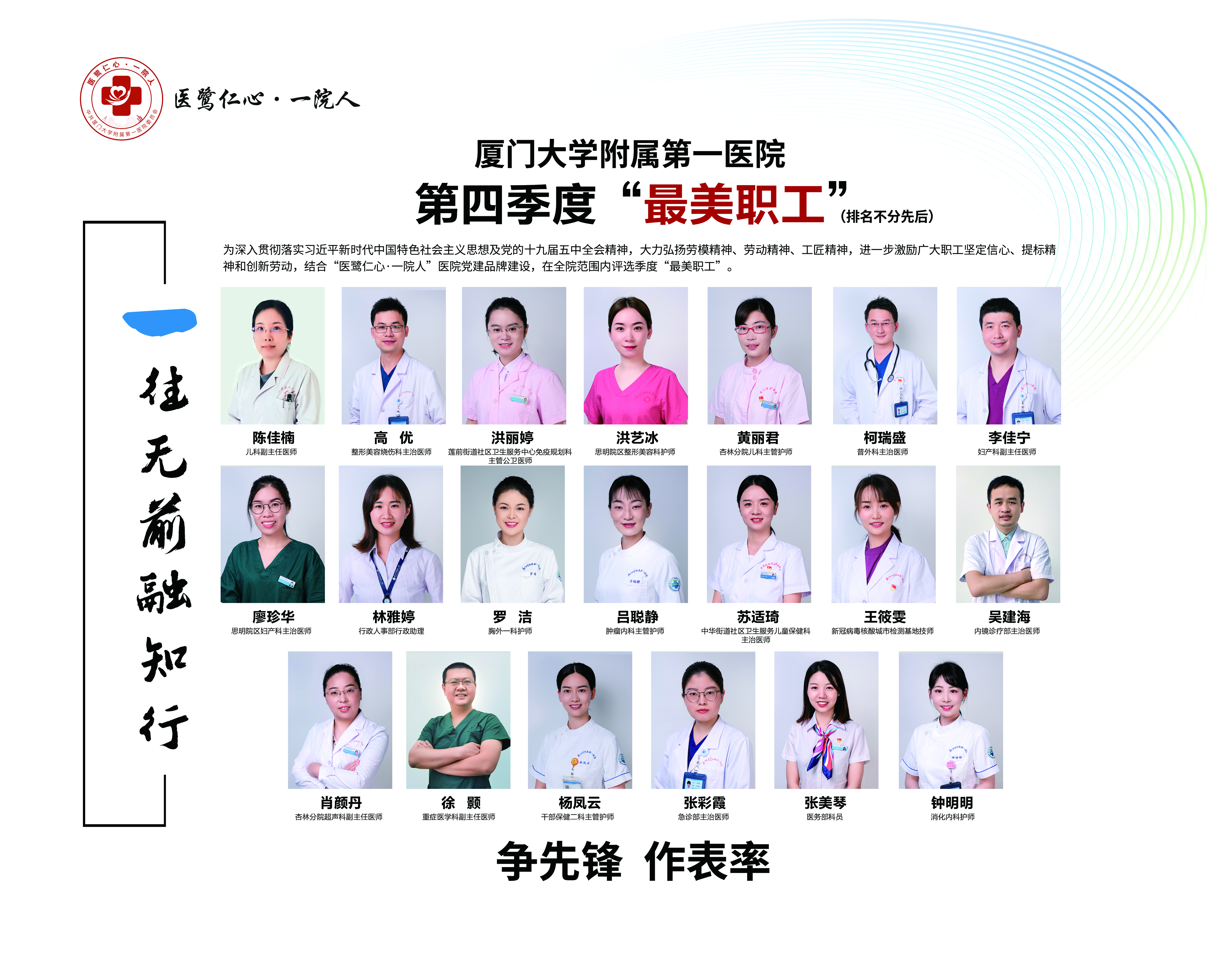根據(jù)《中共廈門大學附屬第一醫(yī)院委員會、廈門大學附屬第一醫(yī)院關于評選季度“最美職工”活動方案》(廈一院黨委〔2021〕2號)工作安排,為樹立正面典型,弘揚正能量,進一步凝聚思想共識,為醫(yī)院高質量發(fā)展匯聚合力,經(jīng)評選,確定林雅婷等20位同志為廈門大學附屬第一醫(yī)院第四季“最美職工”,并予以通報表揚。