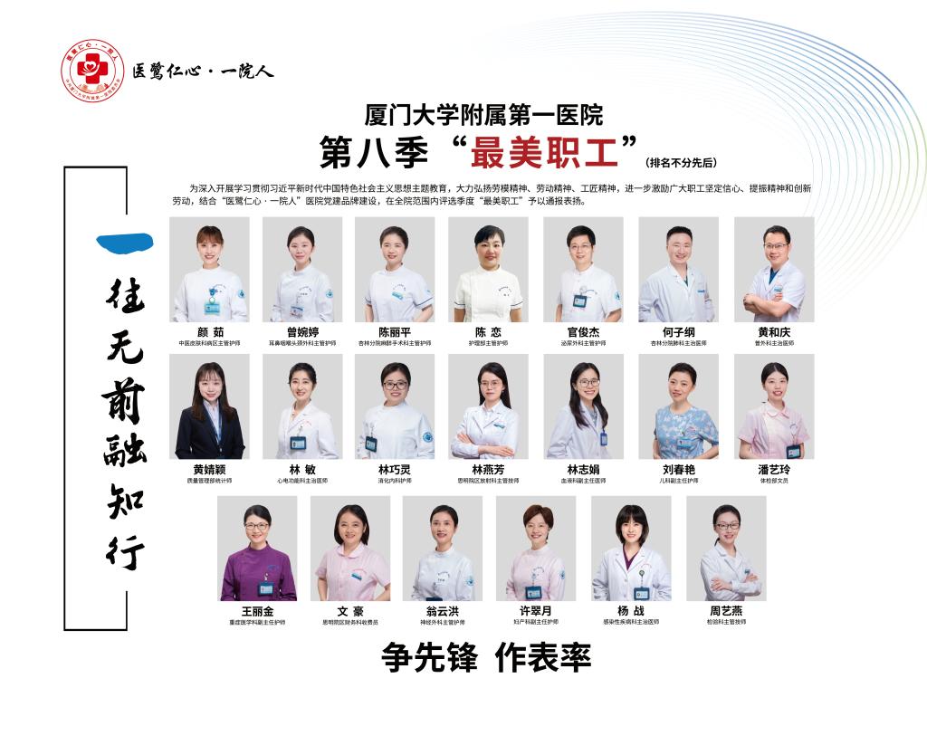 根據《中共廈門大學附屬第一醫(yī)院委員會、廈門大學附屬第一醫(yī)院關于評選季度“最美職工”活動方案》(廈一院黨委〔2021〕2號)工作安排,為樹立正面典型,弘揚正能量,進一步凝聚思想共識,為醫(yī)院高質量發(fā)展匯聚合力,經評選,確定陳戀等20位同志為廈門大學附屬第一醫(yī)院第八季“最美職工”,并予以通報表揚。