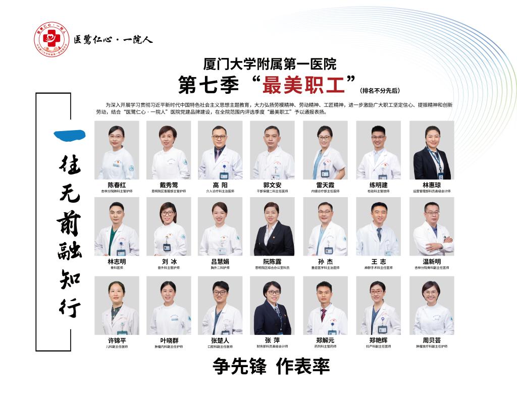 根據(jù)《中共廈門大學(xué)附屬第一醫(yī)院委員會、廈門大學(xué)附屬第一醫(yī)院關(guān)于評選季度“最美職工”活動方案》(廈一院黨委〔2021〕2號)工作安排,為樹立正面典型,弘揚(yáng)正能量,進(jìn)一步凝聚思想共識,為醫(yī)院高質(zhì)量發(fā)展匯聚合力,經(jīng)評選,確定林惠瓊等21位同志為廈門大學(xué)附屬第一醫(yī)院第七季“最美職工”,并予以通報表揚(yáng)。