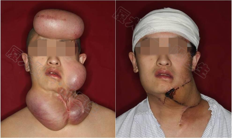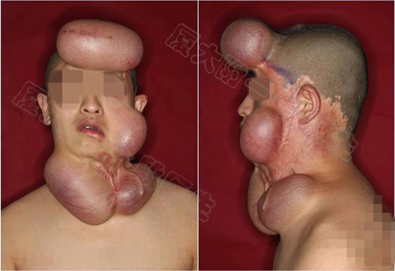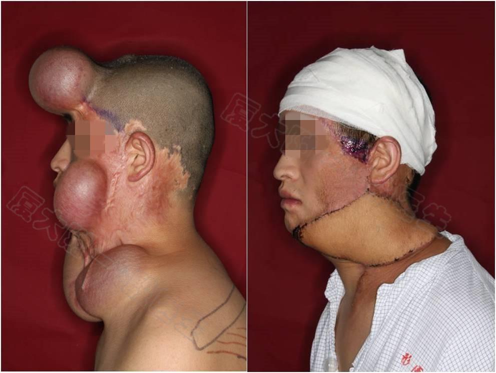 所以,你在上圖中看到的那些腫瘤狀的鼓包的下面就是擴張器。在經(jīng)過3-6個月的擴張后,就可以手術取掉擴張器,這時就可以把瘢痕切除掉,外形會有很大的改善。