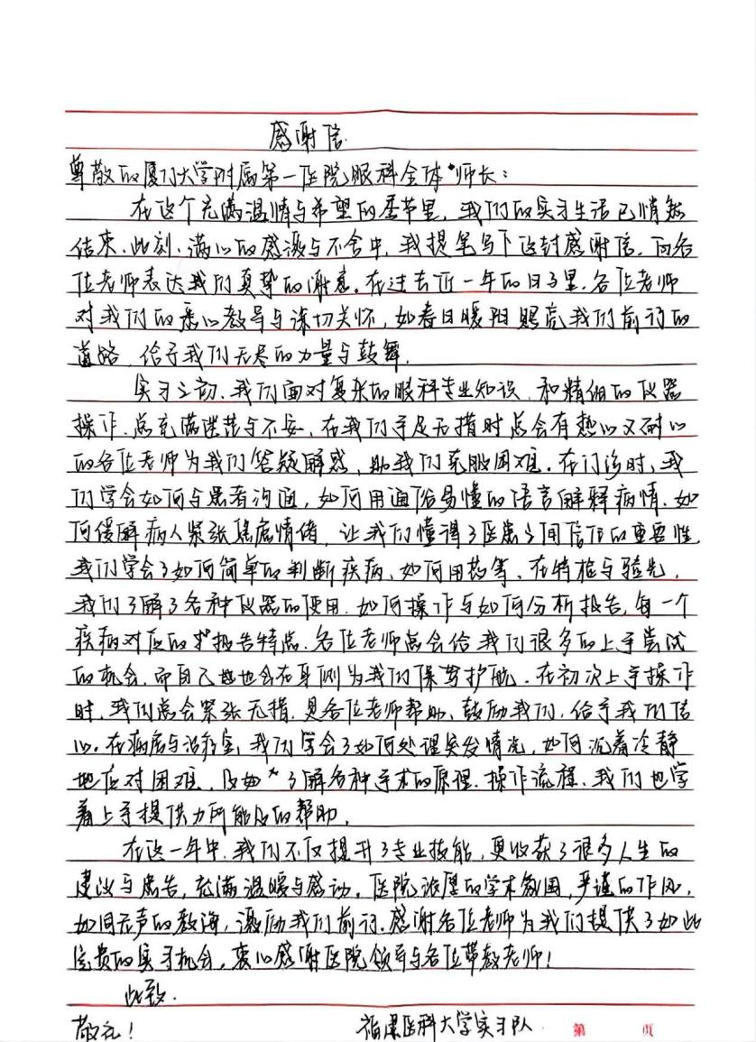 2025年6月,福建醫(yī)科大學(xué)眼視光學(xué)專業(yè)首屆實(shí)習(xí)生在我院眼科完成為期一年的臨床實(shí)踐。臨別之際,實(shí)習(xí)隊以一封手寫感謝信致敬帶教團(tuán)隊,信中特別提及科室"嚴(yán)謹(jǐn)?shù)淖黠L(fēng)如無聲教誨,師長般的關(guān)懷若春日暖陽",這份認(rèn)可印證了我科在醫(yī)學(xué)教育領(lǐng)域的深耕成果。