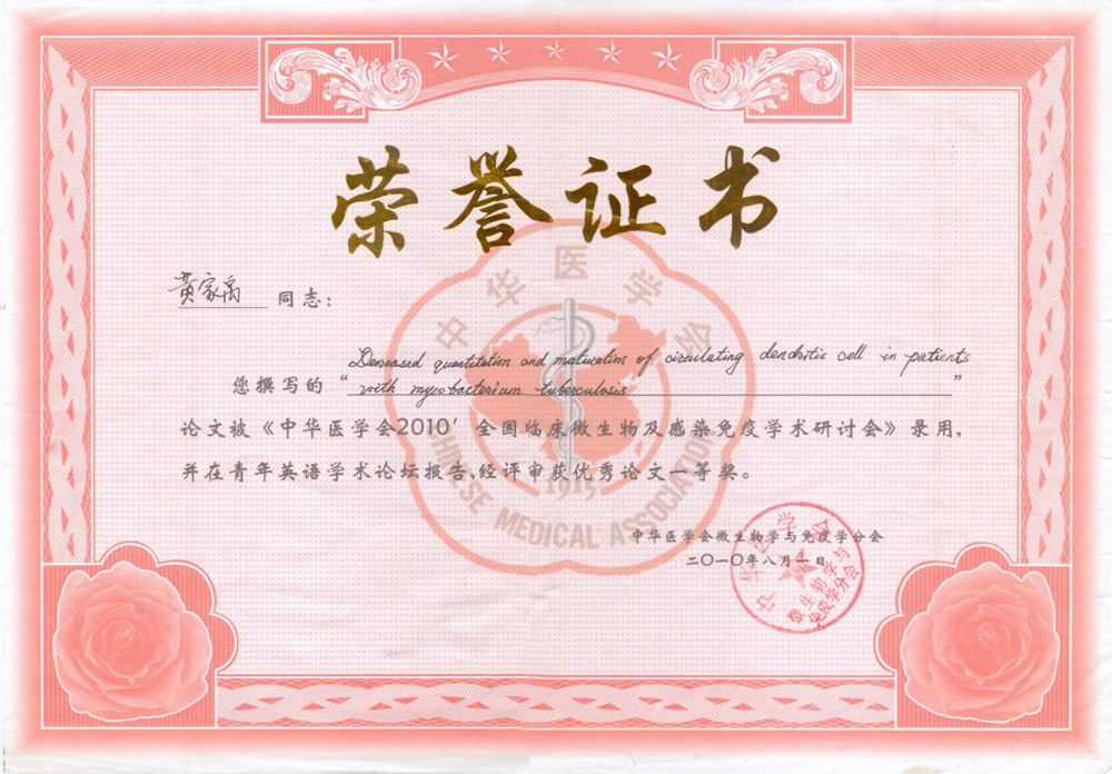 2010年全國(guó)臨床微生物與感染免疫學(xué)術(shù)研討會(huì)于近日在上海召開。我院碩士研究生黃家禹同學(xué)撰寫的論文——《Decreased Quantitation and Maturation of Circulating Dendritic Cell in Patients with Mycobacterium Tuberculosis》經(jīng)過(guò)層層篩選,由專家組推薦,最終獲邀在會(huì)議舉辦的青年英文學(xué)術(shù)論壇中做報(bào)告。報(bào)告時(shí),面對(duì)曹雪濤院士、錢淵教授、戚中田教授、曹斌教授等國(guó)內(nèi)知名專家及來(lái)自美國(guó)的特邀嘉賓Professor Mark A. Feitelson,黃家禹同學(xué)沉著冷靜,不卑不亢,以流利的英文、扎實(shí)的基礎(chǔ)知識(shí)、清晰的思路、切題的回答戰(zhàn)勝了來(lái)自國(guó)內(nèi)著名高校的海歸青年教師及來(lái)自美國(guó)的青年學(xué)者等眾多好手,受到評(píng)委的一致贊賞,以95.8分的好成績(jī)奪得本次青年英文學(xué)術(shù)論壇的冠軍,獲得優(yōu)秀論文一等獎(jiǎng)。