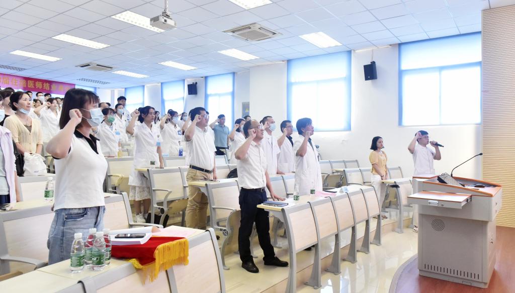 王占祥院長、各專業(yè)基地主任、教學主任、基地秘書、臨床科室?guī)Ы汤蠋煛⒃谂鄬W員及結業(yè)住培醫(yī)師等110余人參加了此次結業(yè)典禮。