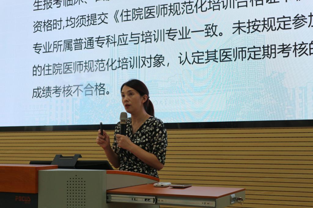 教學(xué)部冉靜老師詳細(xì)介紹了住培政策與管理制度,讓學(xué)員們清楚了解住培期間的學(xué)習(xí)要求、考核標(biāo)準(zhǔn)和職業(yè)發(fā)展路徑;組織人事部黃江峰老師則引導(dǎo)學(xué)員們進(jìn)行住院醫(yī)師角色思考,鼓勵(lì)大家規(guī)劃好自己的職業(yè)發(fā)展方向。醫(yī)保與物價(jià)管理部莊志成老師解讀了醫(yī)保政策與知識,醫(yī)務(wù)與社區(qū)部許慧娜老師強(qiáng)調(diào)了醫(yī)療文書的規(guī)范化書寫,讓學(xué)員們在臨床實(shí)踐中能夠更好地遵守相關(guān)規(guī)定。