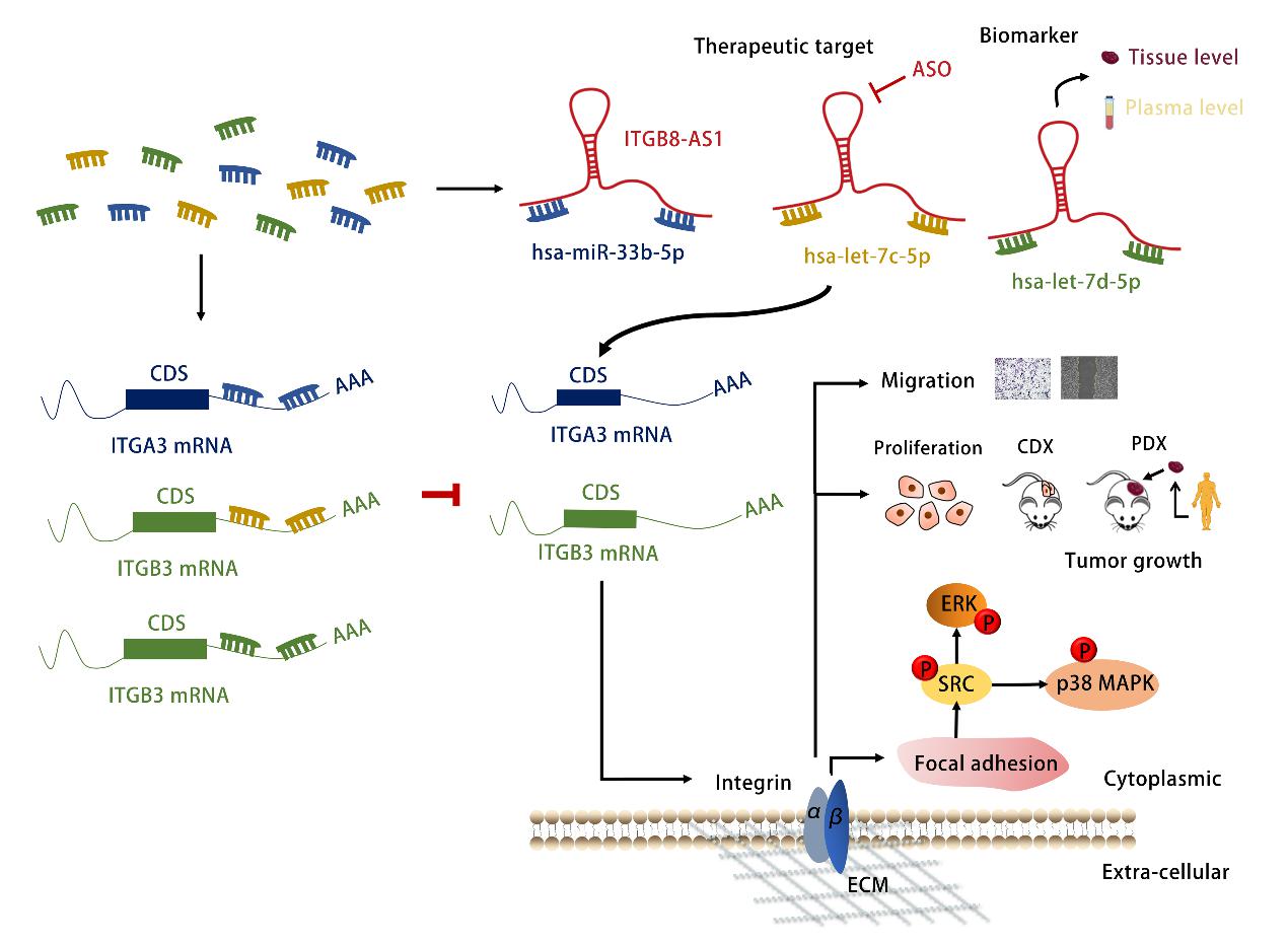 lncRNA代表一類長(zhǎng)度超過200個(gè)核苷酸的非編碼轉(zhuǎn)錄本。越來越多的證據(jù)表明結(jié)直腸癌中異常表達(dá)的lncRNA在腫瘤的生長(zhǎng)和轉(zhuǎn)移等惡性生物學(xué)行為中具有重要作用,其可能作為結(jié)直腸癌患者潛在的新型治療靶點(diǎn)和生物學(xué)標(biāo)志物,具有巨大的臨床應(yīng)用潛力。然而,大多數(shù)lncRNA在結(jié)直腸癌中的功能和機(jī)制尚不清楚。該研究比較結(jié)直腸癌組織和配對(duì)癌旁組織的轉(zhuǎn)錄組學(xué)特征,篩選出功能未明的lncRNA ITGB8-AS1。研究首次對(duì)ITGB8-AS1進(jìn)行功能學(xué)驗(yàn)證尤其是結(jié)直腸癌生長(zhǎng)和轉(zhuǎn)移的作用,結(jié)果發(fā)現(xiàn),ITGB8-AS1敲減可在體外抑制結(jié)直腸癌的增殖、遷移等惡性表型,反之,ITGB8-AS1過表達(dá)則發(fā)揮體外促癌效應(yīng),同時(shí)靶向ITGB8-AS1對(duì)結(jié)直腸癌具有體內(nèi)抑瘤作用。血漿標(biāo)本驗(yàn)證發(fā)現(xiàn),ITGB8-AS1在結(jié)直腸癌患者中高表達(dá),且晚期 (III或IV期) 結(jié)直腸癌患者的ITGB8-AS1血漿表達(dá)水平顯著高于早期 (I-II期) 患者,低分化患者顯著高于中高分化患者。以上結(jié)果提示,ITGB8-AS1是結(jié)直腸癌患者潛在的新型治療靶點(diǎn)和血漿生物學(xué)標(biāo)志物。進(jìn)一步的機(jī)制研究發(fā)現(xiàn),黏著斑信號(hào)通路是ITGB8-AS1最重要的下游信號(hào)通路之一,主要定位于細(xì)胞質(zhì)中的ITGB8-AS1通過ceRNA方式海綿吸附miRNAs而作用于靶基因即整合素家族成員ITGA3和ITGB3 (整合素家族為黏著斑信號(hào)通路的關(guān)鍵分子)。
