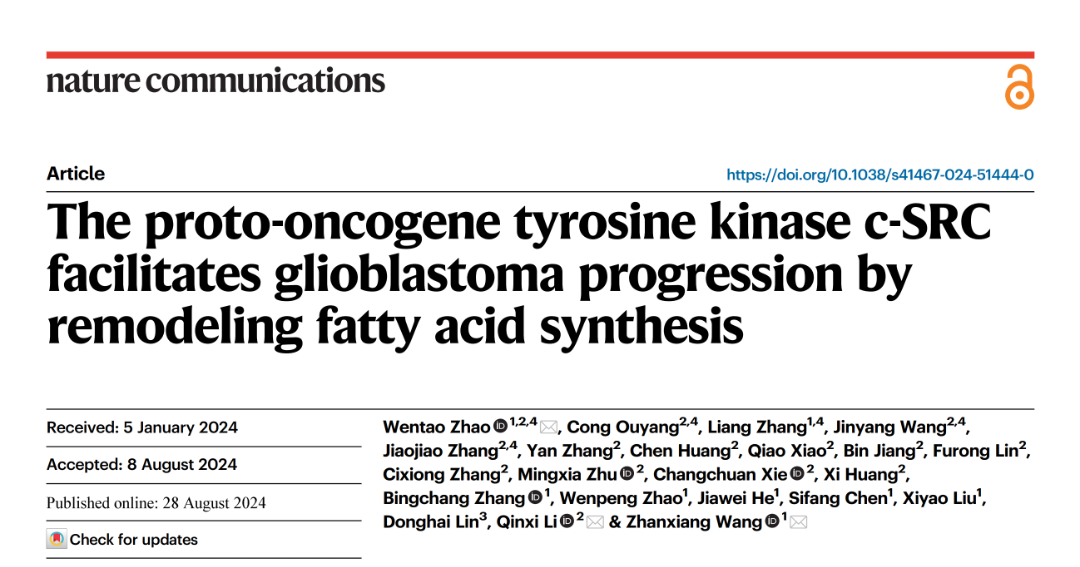 2024年8月28日,國(guó)際頂級(jí)期刊《Nature 》子刊《Nature Communications》刊發(fā)了王占祥教授團(tuán)隊(duì)和李勤喜教授團(tuán)隊(duì)合作的重磅研究成果:“The proto-oncogene tyrosine kinase c-SRC facilitates glioblastoma progression by remodeling fatty acid synthesis”(《原癌酪氨酸激酶c-SRC通過(guò)重塑脂肪酸合成促進(jìn)膠質(zhì)母細(xì)胞瘤的進(jìn)展》)。