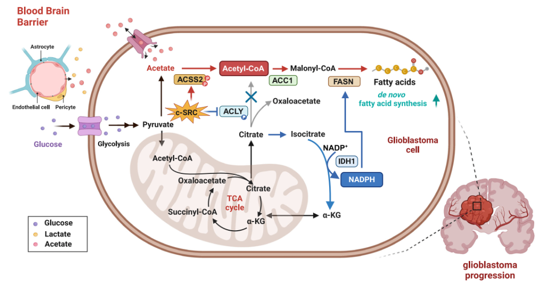 原癌基因c-SRC在膠質(zhì)瘤中廣泛激活,通過(guò)磷酸化激活A(yù)CSS2促進(jìn)乙酸生成乙酰輔酶A,同時(shí)磷酸化抑制ACLY使檸檬酸分流至IDH1催化反應(yīng),促進(jìn)NADPH產(chǎn)生。