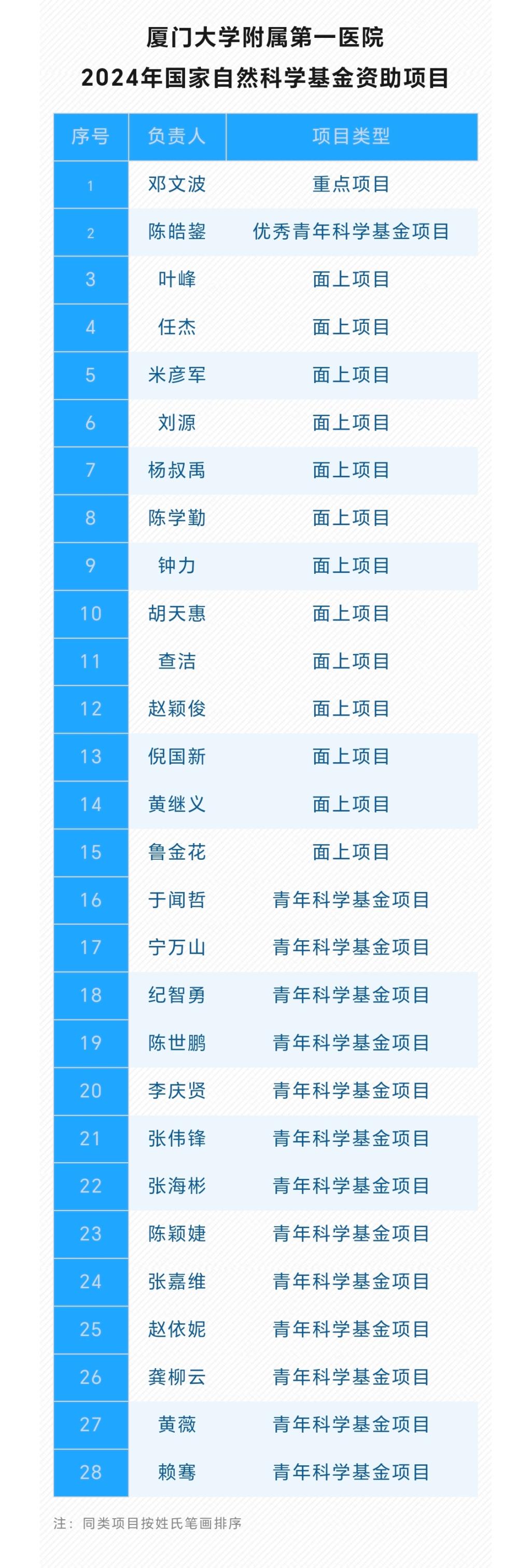 這28個立項中,優(yōu)秀青年科學(xué)基金項目1項、重點項目1項、面上項目13項、青年科學(xué)基金項目13項。