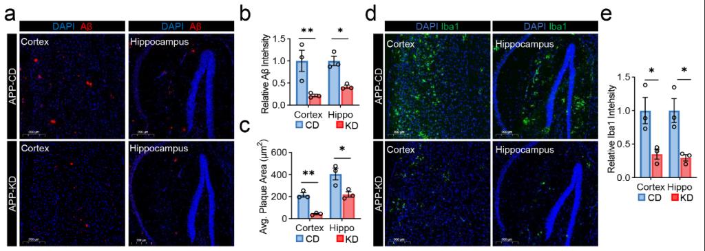 圖1.4.生酮飲食(KD)治療可減輕APP/PS1小鼠病理。(a) 對照或生酮飲食處理的APP/PS1小鼠海馬和皮層中Aβ斑塊的免疫熒光染色的代表性圖像。 (b,c)對(a)中Aβ強度(b)和平均大小(c)的進行定量分析。 (d) 對照或生酮飲食處理的APP/PS1小鼠海馬和皮層中Iba1免疫熒光染色的代表性圖像。(e)對(d)中Iba1強度進行相對定量分析。