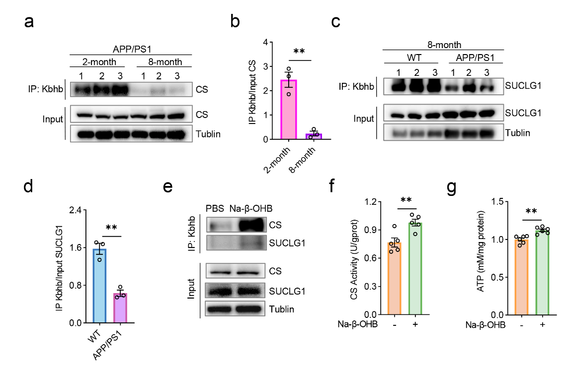圖1.2. CS和SUCLG1的β-羥基丁?;揎椊档团cAPP/PS1小鼠疾病發(fā)生發(fā)展相關(guān)。(a,b) 使用β-羥基丁酰化進行免疫沉淀,并使用CS抗體進行western blot檢測。 (c,d) 使用β-羥基丁?;?/span>抗體進行免疫共沉淀,并使用SUCLG1抗體進行western blot 檢測。 (e) HT22細胞用PBS或10 mM Na-β-OHB處理24 h。使用β-羥基丁?;?/span>抗體進行免疫共沉淀,并使用CS或SUCLG1抗體進行western blot分析。(f,g) HT22細胞用PBS或10 mM Na-β-OHB處理24 h。檢測CS酶活性(f)和ATP含量(g)。