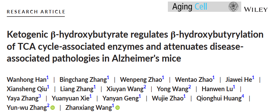 2024年10月16日,廈門大學(xué)附屬第一醫(yī)院王占祥教授團隊和廈門大學(xué)張云武教授團隊在Aging Cell雜志(IF:8.0/Q1 TOP)在線發(fā)表了題為“Ketogenic β-hydroxybutyrate regulates β-hydroxybutyrylation of TCA cycle-associateed enzymes and attenuates disease-associated pathologies in Alzheimer’s mice”的文章,闡述了生酮飲食通過新型蛋白質(zhì)翻譯后修飾β-羥基丁?;{(diào)控神經(jīng)元能量代謝改善APP/PS1小鼠病理表型的分子機制。