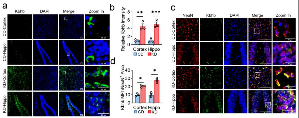 圖1.3.生酮飲食增加APP/PS1小鼠神經(jīng)元β-羥基丁酰化修飾水平。(a) 對照或生酮飲食處理的APP/PS1小鼠海馬和皮層中β-羥基丁?;揎椕庖邿晒馊旧拇硇詧D像。 (b)對(a)中Kbhb的強度進行定量分析。 (c,) 對照或生酮飲食處理的APP/PS1小鼠海馬和皮層中與NeuN共染的β-羥基丁?;揎棿硇詧D像。 (d)NeuN陽性細胞中β-羥基丁?;揎棌姸鹊亩糠治觥?/span>