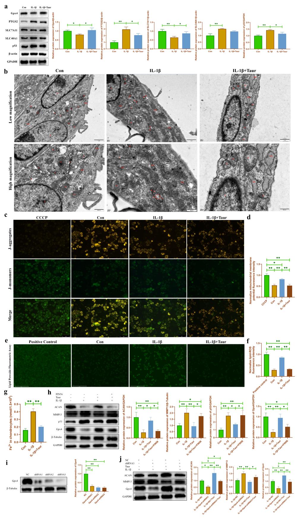 為了驗證Gpx4依賴的鐵死亡參與介導牛磺酸對軟骨細胞炎性損傷的保護作用。我們首先使用WB檢測發(fā)現(xiàn)牛磺酸能夠部分逆轉IL-1β誘導的軟骨細胞鐵死亡相關蛋白的表達(圖4a)。隨后,我們使用透射電鏡發(fā)現(xiàn)?;撬崮軌蚋纳?/span>IL-1β誘導的線粒體嵴和線粒體膜損傷(圖4b)。進一步使用JC-1檢測發(fā)現(xiàn)?;撬崮軌蚧謴途€粒體膜電位(圖4c-d)。脂質過氧化累積是細胞鐵死亡的重要特征之一。我們的研究發(fā)現(xiàn)?;撬崮軌蝻@著抑制軟骨細胞中脂質過氧化的累積(圖4e-f)。此外,我們使用亞鐵離子檢測試劑盒發(fā)現(xiàn)牛磺酸可以有效降低軟骨細胞內(nèi)亞鐵離子濃度,從而緩解軟骨細胞鐵死亡(圖4g)。由于Gpx4是鐵死亡的關鍵蛋白。我們分別使用Gpx4的小分子抑制劑FIN56和shRNA來抑制Gpx4的表達,結果發(fā)現(xiàn)抑制Gpx4表達能夠部分逆轉?;撬釋ρ仔攒浌羌毎谋Wo作用(圖4h-j)。