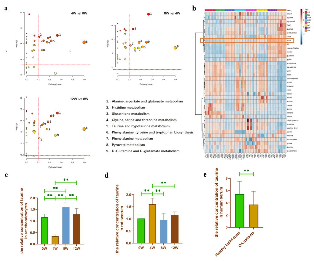 圖2. 前交叉韌帶撕裂術后不同時間點大鼠軟骨細胞的代謝組學分析。(a: 軟骨細胞代謝物的代謝途徑分析;b:軟骨細胞代謝物濃度熱圖;c:通過代謝組學分析ACLT組與Sham組軟骨細胞牛磺酸濃度的相對比值;d:通過代謝組學分析ACLT組與Sham組之間血清牛磺酸濃度的相對比值;e:通過代謝組學分析OA患者與非OA患者血清?;撬釢舛鹊南鄬Ρ戎?/span>。)