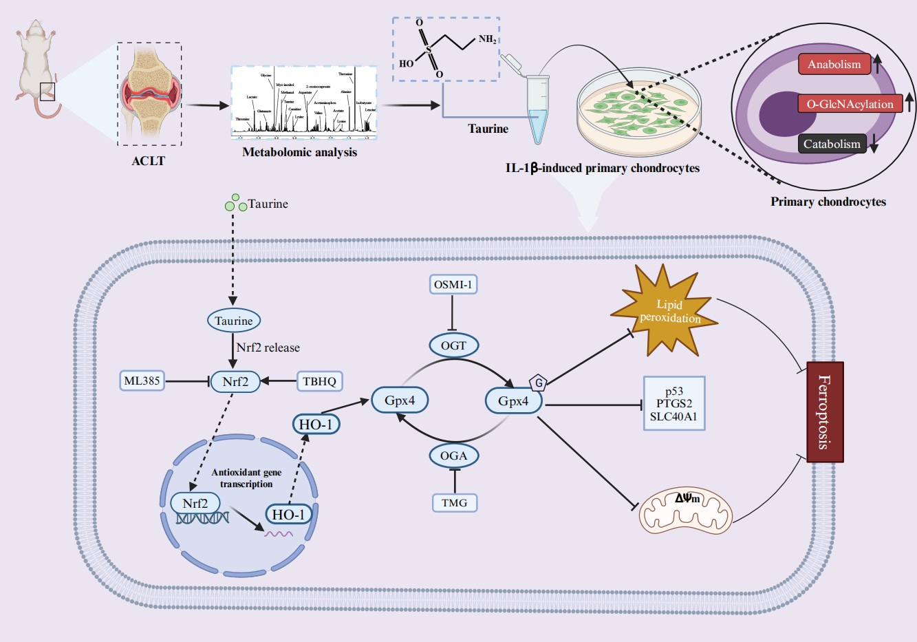 骨關節(jié)炎(Osteoarthritis, OA)是一種慢性退行性關節(jié)疾病。與其他類型的OA不同,繼發(fā)于運動損傷的OA有明確的損傷事件。這種明確的 “起始點”事件為運動損傷繼發(fā)OA的針對性預防和治療提供了可能。深入探究運動損傷繼發(fā)OA的潛在機制對科學有效地預防繼發(fā)性OA是至關重要的。代謝組學作為生命科學研究領域的新興研究手段,通過高通量檢測和分析細胞代謝的小分子底物、中間產(chǎn)物和終產(chǎn)物,可即時反映和了解細胞生理和病理的動態(tài)變化,從而從代謝角度解釋疾病發(fā)生和發(fā)展過程中的內(nèi)在機制。在本研究中,我們通過使用前交叉韌帶橫斷術(ACL transection, ACLT)構建運動損傷繼發(fā)OA的大鼠動物模型。提取ACLT術后不同周齡(0w,4w,8w和12w)大鼠的原代軟骨細胞進行代謝組學分析。結果發(fā)現(xiàn)?;撬峥赡苁菍е逻\動損傷繼發(fā)OA進展的關鍵代謝分子。隨后,使用牛磺酸處理炎性軟骨細胞后進行轉錄組學和代謝組學發(fā)現(xiàn),O-GlcNAc轉移酶(OGT)依賴的O-GlcNAcylation和Gpx4依賴的鐵死亡可能是介導牛磺酸對軟骨細胞的炎癥保護作用的潛在機制。這一研究假設通過功能驗證得到證實。隨后,進一步的實驗表明,Gpx4 與 OGT 蛋白可能存在直接結合位點,這為 Gpx4 蛋白可能存在 O-GlcNAc糖基化修飾提供了證據(jù)。最后,我們通過動物實驗證明了OGT依賴的O-GlcNAcylation和Gpx4依賴的鐵死亡可能是?;撬岜WoACL損傷小鼠軟骨退化的潛在機制。綜上所述,本研究闡明了?;撬崮軌蛲ㄟ^激活OGT/Gpx4 信號抑制軟骨細胞鐵死亡,從而緩解OA小鼠軟骨退變。該研究為運動損傷繼發(fā)OA的預防和治療提供了新的方向。