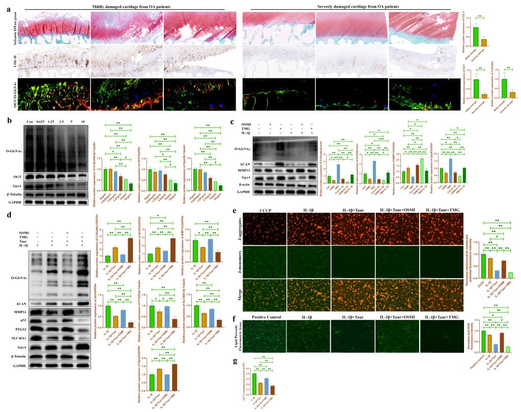 圖5. ?;撬嵬ㄟ^促進O-GlcNAcylation緩解軟骨細胞炎性損傷。(a:輕度/重度損傷OA患者軟骨組織的番紅O固綠染色以及COL-II,O-GlcNAc(紅色標記)和OGT(綠色標記)蛋白的免疫染色;b:通過WB檢測不同濃度IL-1β處理后軟骨細胞中O-GlcNAc 和OGT蛋白表達的改變;c:通過WB檢測OSMI/TMG處理后的炎性軟骨細胞中O-GlcNAc以及代謝相關蛋白表達的改變;d:通過WB檢測在?;撬崽幚砗?,OSMI/TMG對炎性軟骨細胞中O-GlcNAc以及代謝相關蛋白表達的影響;e:通過JC-1檢測在?;撬崽幚砗?,OSMI/TMG對炎性軟骨細胞中線粒體膜電位的影響;f:通過脂質過氧化物檢測試劑盒檢測在?;撬崽幚砗?,OSMI/TMG對炎性軟骨細胞中脂質過氧化物的影響;g:通過亞鐵離子比色檢測試劑盒檢測在?;撬崽幚砗螅?/span>OSMI/TMG對炎性軟骨細胞中亞鐵離子濃度的影響。)