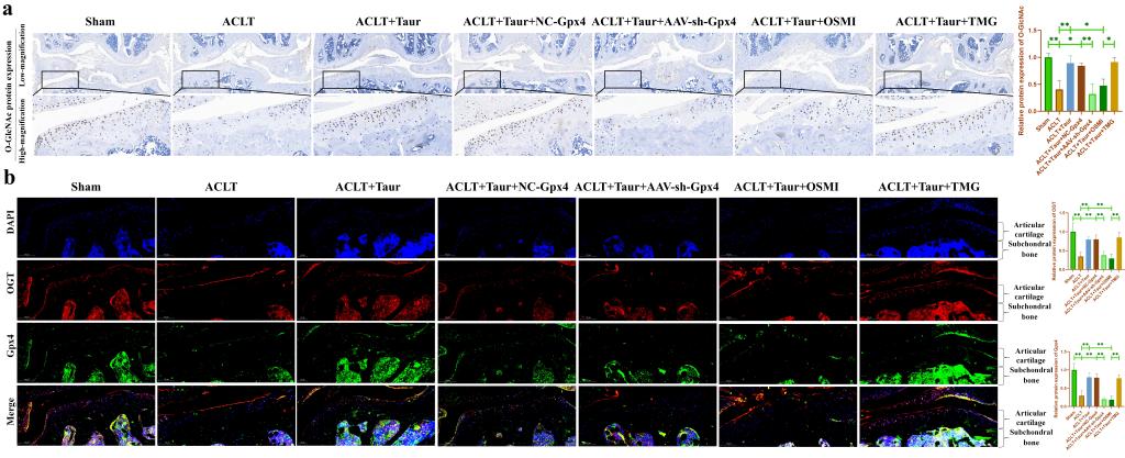 圖9. O-GlcNAcylation和Gpx4參與介導?;撬峋徑?/span>ACLT小鼠軟骨退變。(a:通過免疫組化染色檢測小鼠膝關節(jié)軟骨中O-GlcNAc總蛋白表達的改變;b:通過免疫熒光染色檢測小鼠膝關節(jié)軟骨中OGT和Gpx4蛋白表達。)