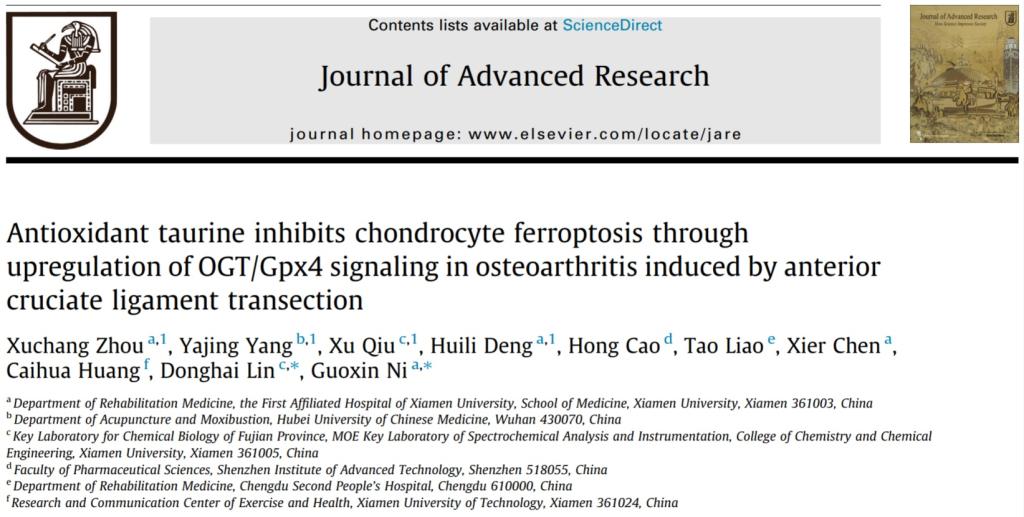 近期,我院康復醫(yī)學科倪國新教授團隊在《Journal of Advanced Research》期刊上發(fā)表題目為:“Antioxidant taurine inhibits chondrocyte ferroptosis through upregulation of OGT/Gpx4 signaling in osteoarthritis induced by anterior cruciate ligament transection”的文章。該文章探究了?;撬嵬ㄟ^激活OGT/Gpx4 信號抑制軟骨細胞鐵死亡,從而緩解OA小鼠軟骨退變的作用機制,為運動損傷繼發(fā)OA的預防和治療提供了新的方向。文章的通訊作者是廈門大學附屬第一醫(yī)院康復醫(yī)學科倪國新教授和廈門大學化學化工學院林東海教授;第一作者是倪國新教授課題組博士生周緒昌,聯(lián)合培養(yǎng)研究生楊雅靜,鄧輝麗以及林東海教授課題組博士生邱旭。