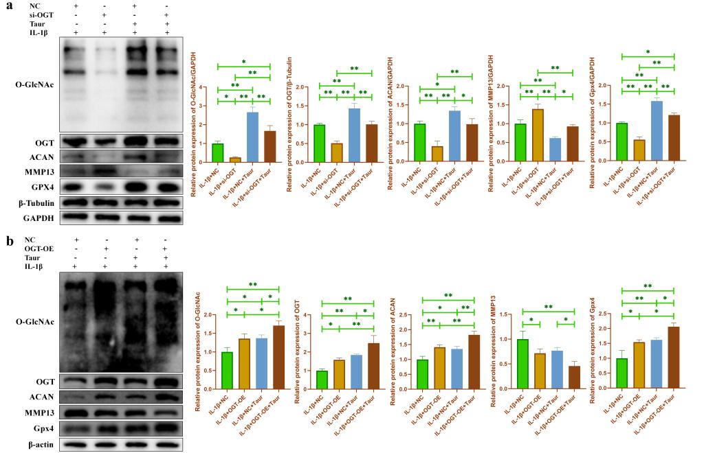 圖6. OGT依賴的O-GlcNAcylation介導牛磺酸對炎性軟骨細胞的保護作用。(a: 使用WB檢測在?;撬崽幚砗?,敲低OGT對炎性軟骨細胞代謝相關蛋白和Gpx4蛋白表達的影響;b:使用WB檢測在?;撬崽幚砗?,過表達OGT對炎性軟骨細胞代謝相關蛋白和Gpx4蛋白表達的影響。)