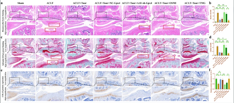 圖8. ?;撬峋徑?/span>ACLT小鼠的軟骨退變。(a:小鼠膝關節(jié)的HE染色;b:小鼠膝關節(jié)的Mankin評分;c:小鼠膝關節(jié)的番紅O固綠染色;d:小鼠膝關節(jié)的OARSI評分;e-f:通過免疫組化染色檢測小鼠膝關節(jié)軟骨中COL-II蛋白表達的改變。)