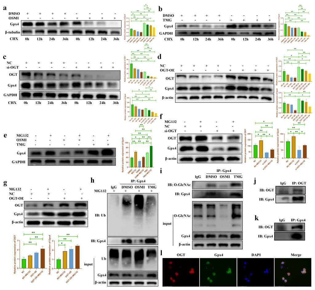 圖7. OGT促進Gpx4的蛋白穩(wěn)定性。(a-b:不同時間點 CHX(1μM)處理后,OSMI/TMG對Gpx4 蛋白降解的影響;c-d:不同時間點 CHX(1μM)處理后,敲低/過表達 OGT對Gpx4蛋白降解的影響;e:在MG132存在或不存在的情況下,OSMI/TMG對Gpx4蛋白降解的影響;f-g:在MG132存在或不存在的情況下,OGT 的敲低/過表達對Gpx4蛋白降解的影響;h:免疫沉淀實驗表明Gpx4蛋白可能存在 O-GlcNAcylation;i-k:免疫共沉淀實驗證明Gpx4蛋白與OGT蛋白之間可能存在相互作用;l:免疫熒光實驗證明Gpx4蛋白與OGT蛋白之間可能存在相互作用。)