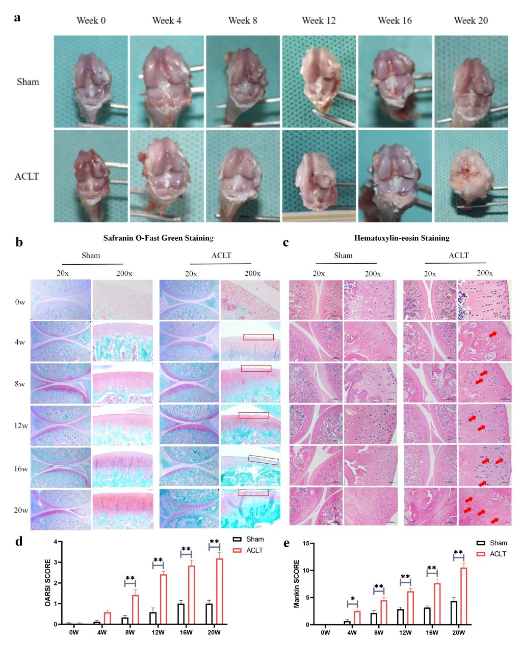 圖1. 前交叉韌帶撕裂術后不同時間點大鼠膝關節(jié)軟骨改變。(a: 大鼠膝關節(jié)的大體觀察;b: 大鼠膝關節(jié)的番紅O固綠染色;c: 大鼠膝關節(jié)的HE染色;d:大鼠膝關節(jié)的OARSI評分;e:大鼠膝關節(jié)的Mankin評分。)