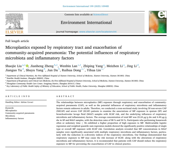 近日,廈門(mén)大學(xué)附屬第一醫(yī)院臨床營(yíng)養(yǎng)科劉少杰博士、呼吸與危重癥醫(yī)學(xué)科林益華主任聯(lián)合復(fù)旦大學(xué)公共衛(wèi)生學(xué)院董瑞華副教授在環(huán)境科學(xué)與生態(tài)學(xué)頂級(jí)期刊《Environment International》(中科院一區(qū),IF=10.3)發(fā)表了題為“Microplastics exposed by respiratory tract and exacerbation of community-acquired pneumonia: The potential influences of respiratory microbiota and inflammatory factors”的最新研究成果。該項(xiàng)研究使用先進(jìn)熱解氣相色譜串聯(lián)質(zhì)譜檢測(cè)方法證明了社區(qū)獲得性肺炎患者的痰液與肺泡灌洗液中均存在微塑料,經(jīng)呼吸道暴露微塑料與重癥社區(qū)獲得性肺炎的風(fēng)險(xiǎn)呈正相關(guān),并可能伴隨著呼吸道微生物群的改變和炎癥因子的釋放。廈門(mén)大學(xué)附屬第一醫(yī)院臨床營(yíng)養(yǎng)科劉少杰博士、安利(中國(guó))研發(fā)中心鄭劍恒博士、廈門(mén)大學(xué)附屬第一醫(yī)院呼吸與危重癥醫(yī)學(xué)科蘭文斌副主任醫(yī)師為該論文的共同第一作者;復(fù)旦大學(xué)公共衛(wèi)生學(xué)院董瑞華副教授與廈門(mén)大學(xué)附屬第一醫(yī)院呼吸與危重癥醫(yī)學(xué)科林益華主任為該論文的共同通訊作者。廈門(mén)大學(xué)附屬第一醫(yī)院臨床營(yíng)養(yǎng)科和呼吸與危重癥醫(yī)學(xué)科分別為該論文的第一單位及最后通訊單位。