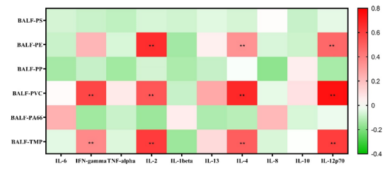 圖3. 肺泡灌洗液中MP濃度與炎癥因子的相關(guān)性熱圖