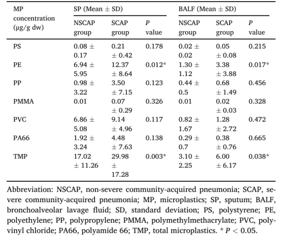 本研究招募了在廈門(mén)大學(xué)第一附屬醫(yī)院呼吸與危重癥醫(yī)學(xué)科就醫(yī)的CAP患者,并根據(jù)成人社區(qū)獲得性肺炎嚴(yán)重程度評(píng)分分為SCAP組(n=24)和NSCAP組(n=26)。參與者報(bào)告基本信息、生活行為方式、以及接觸空氣傳播MPs的情況。為表征上、下呼吸道MPs的暴露,本研究同時(shí)收集了參與者的痰液樣本和肺泡灌洗液樣本,所有樣本使用熱裂解氣相色譜串聯(lián)質(zhì)譜法檢測(cè)MPs;肺泡灌洗液樣本使用16S rRNA測(cè)序檢測(cè)微生物群;液體流式檢測(cè)技術(shù)檢測(cè)炎癥因子的表達(dá)水平。