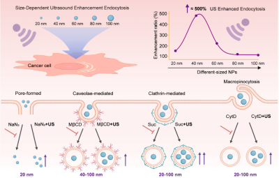 實驗結(jié)果顯示:超聲能顯著增強20至80 nm尺寸范圍內(nèi)納米顆粒的細胞內(nèi)吞效率,且效果呈現(xiàn)出強烈的尺寸依賴性。其中,40 nm的顆粒在超聲作用下內(nèi)吞效率提升了3.8倍,表現(xiàn)出最優(yōu)的超聲響應(yīng)性能。進一步的機制研究證明了超聲的雙重作用:不僅可以通過“聲孔效應(yīng)”為納米顆粒打開非能量依賴性的“快速通道”;更重要的是能夠“解鎖”并激活細胞自身的多種內(nèi)吞途徑,甚至逆轉(zhuǎn)小窩蛋白、網(wǎng)格蛋白等多種內(nèi)吞抑制劑的“封鎖”作用,從而大幅提升納米顆粒的入胞效率。該研究首次系統(tǒng)闡明了納米顆粒尺寸在超聲增強內(nèi)吞過程中的核心地位,并揭示了超聲通過激活多種內(nèi)吞途徑協(xié)同“聲孔效應(yīng)”促進藥物入胞的雙重機制。相關(guān)發(fā)現(xiàn)為設(shè)計具有尺寸可控與超聲響應(yīng)性能的下一代藥物遞送系統(tǒng)提供了數(shù)據(jù)支撐和理論指導(dǎo)。