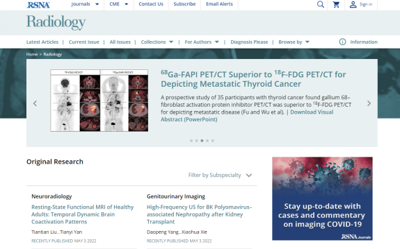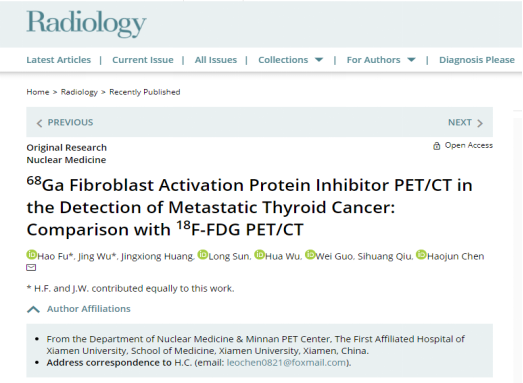 近日,廈門大學(xué)附屬第一醫(yī)院核醫(yī)學(xué)科及閩南PET中心團隊在醫(yī)學(xué)影像領(lǐng)域頂級期刊《Radiology》(JCR Q1區(qū),IF=29.1)發(fā)表了題為“68Ga Fibroblast Activation Protein Inhibitor PET/CT in the Detection of Metastatic Thyroid Cancer: Comparison with 18F-FDG PET/CT”的研究論著,并獲Radiology官網(wǎng)首頁推薦論文。該研究首次將68Ga-FAPI PET/CT與常規(guī)18F-FDG PET/CT在轉(zhuǎn)移性甲狀腺癌患者中進行了前瞻性的頭對頭比較。廈門大學(xué)附屬第一醫(yī)院核醫(yī)學(xué)科及閩南PET中心陳皓鋆副主任醫(yī)師為通訊作者,付浩博士為該項工作的第一作者。